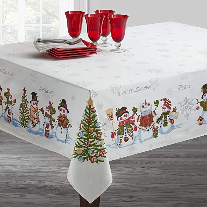 52% algodón, 48% poliéster; Fácil Cuidado, algodón rico .; Instructions de Cuidado: Lavar a máquina en frío, ciclo suave. Lavar los colores oscuros por Separado. Utilizació unicamente blanqueador sin cloro. Seca a máquina una baja Temperatura. Retira con Rapidez. Ligeramente plancha Si Es Necesario .; Diseño para especial Navidad .; Presenta Una impresión de Ingeniería de la Flor navideña de muñeco de nieve de invierno Que aportará elegancia a la mesa de su Cena navideña .; Patrones creativos: Tamaño: 60 x 84 Rectangular | Color: Creer muñeco de nieve