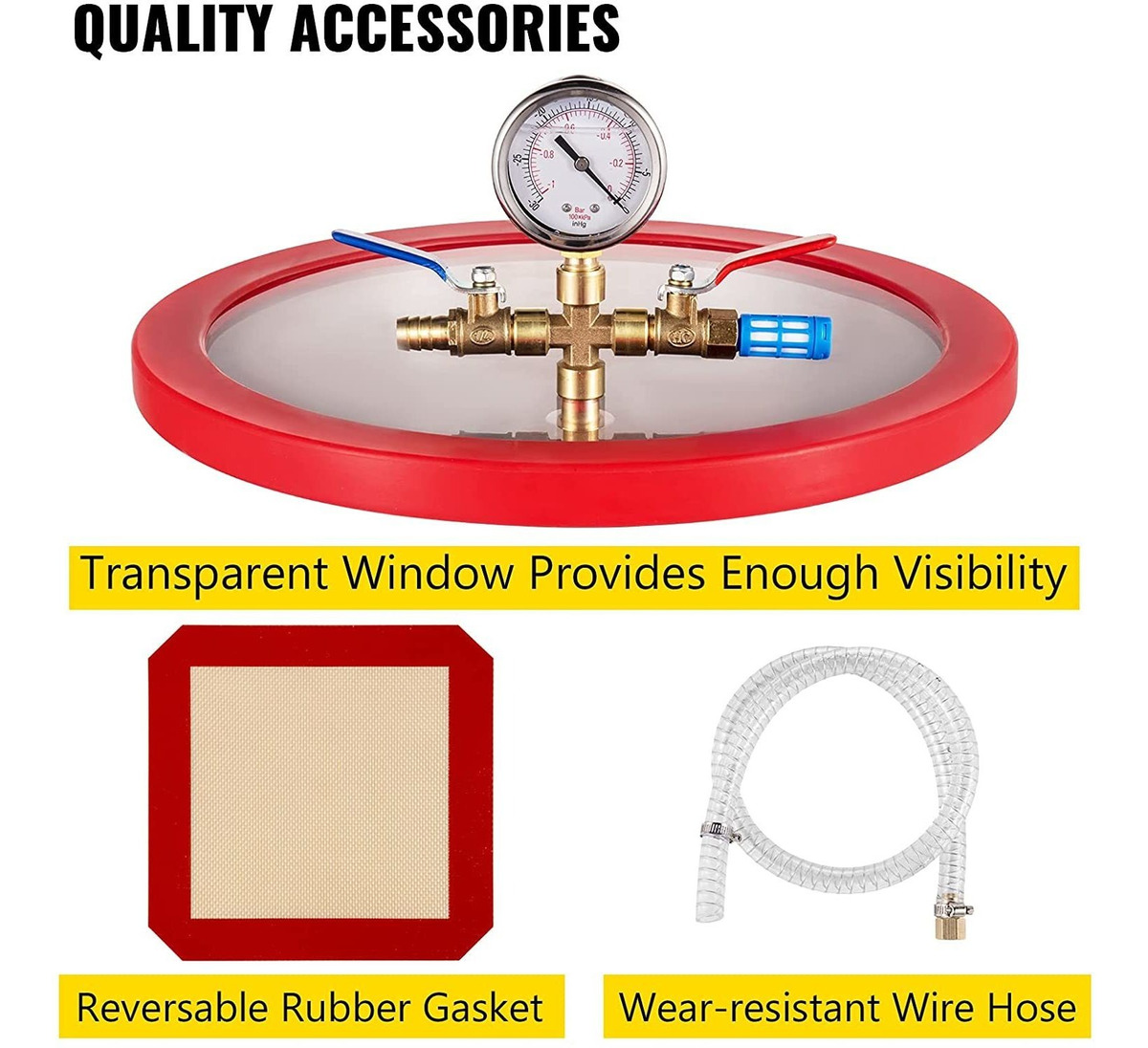 Bomba de vacío resistente: FAD: 3CFM, etapa única; potencia: 1/4 HP; vacío definitivo: 5PA. Nuestra bomba de vacío HVAC está hecha de aleación de aluminio resistente con buenas capacidades de disipación de calor, duradera y resistente. Se adopta un motor de cobre fuerte para un funcionamiento estable. Además, cuenta con un diseño de flujo trasero sin aceite para evitar la contaminación de la cámara.; Cámara de vacío premium: la cámara de vacío de acero inoxidable es de alta resistencia, puede soportar hasta 160 F. Está equipado con dos silenciadores para reducir el ruido y hacer que la bomba funcione más silenciosa. El filtro de aire de 50 micras reduce el flujo de aire de nuevo en la cámara para purgar y evita que los desechos entren en la cámara.; Fácil monitoreo y refrigeración: esta bomba de vacío de CA viene equipada con una ventana de visualización de aceite para controlar los niveles de aceite fácilmente y evitar la deficiencia de aceite. Los radiadores inteligentes pueden enfriarse y evitar que las cosas pegadas se quemen. La función de protección térmica integrada puede evitar que la máquina se queme.; Accesorios prácticos: la cámara de vacío tiene una tapa de cristal acrílico de 0.7 in, conveniente para observar el estado interno, y es a prueba de balas. La junta de silicona antiadherente te permite limpiar las mezclas fácilmente. La manguera está construida con alambre de acero para garantizar la resistencia y durabilidad.; Amplia aplicación: el dispositivo viene con una bomba de vacío de 3 CFM y una cámara de vacío de 3 galones de calidad superior. La bomba cuenta con un mango ergonómico para una comodidad y portabilidad superiores. El kit de cámara de vacío es adecuado para el aire acondicionado doméstico, mantenimiento de automóviles, embalaje al vacío, vacío de refrigerador, industria, etc. Todos nuestros productos estan en inglés SKU 91221089234