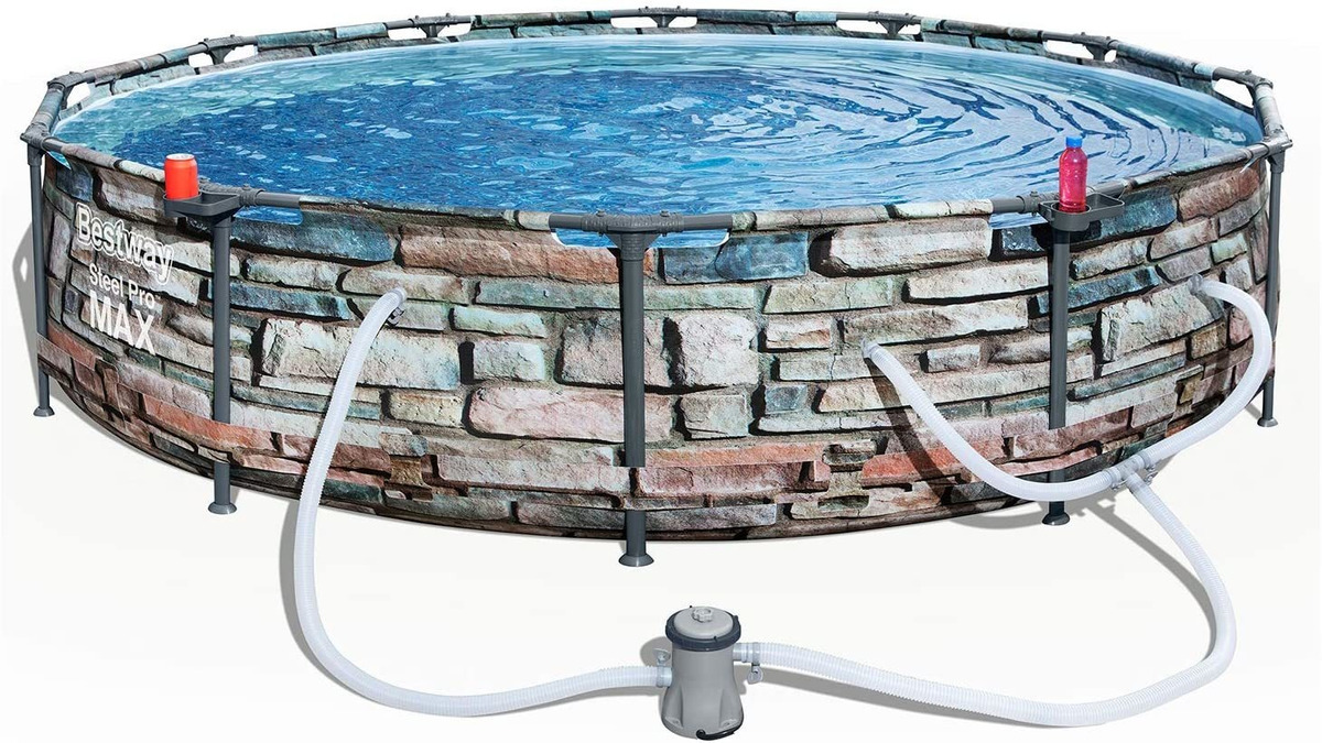 Diversión sin fin de verano: niños y adultos de todas las edades pueden disfrutar de la natación y salpicaduras en la piscina de Bestway Power Steel. Es la alternativa asequible a una piscina de pared de acero más complicada, pero proporciona durabilidad y estabilidad mayor que las opciones de piscina inflable.; Diseño de marco superior: el marco de piscina de 12 pies x 30 pulgadas se aplica con un revestimiento resistente al óxido y a la corrosión para proteger la piscina de daños UV y abrasión. Una banda de apoyo de PVC de 3 capas rodea la piscina para mayor estabilidad a la pared de la piscina; Incluye: piscina, bomba de filtro de 330 GPH, parche de reparación resistente, DVD instructivo y cartucho de filtro; Resistente a la flexión o fugas: el sistema Seal Lock es un diseño de marco patentado que hace que cada conexión de junta sea segura y no se dobla ni se fuga por la presión del agua. Un diseño de clip de pin es otra característica de seguridad para garantizar conexiones estables; Juego de piscina fácil de montar: no se necesitan herramientas para instalar esta piscina sobre el suelo en tu patio. Una válvula de drenaje controlada por flujo proporciona una solución sencilla para vaciar el exceso de agua; Capacidad de agua (90%): 1.710 galones; Capacidad: 5 personas Color:color fantasía (Stone Print)