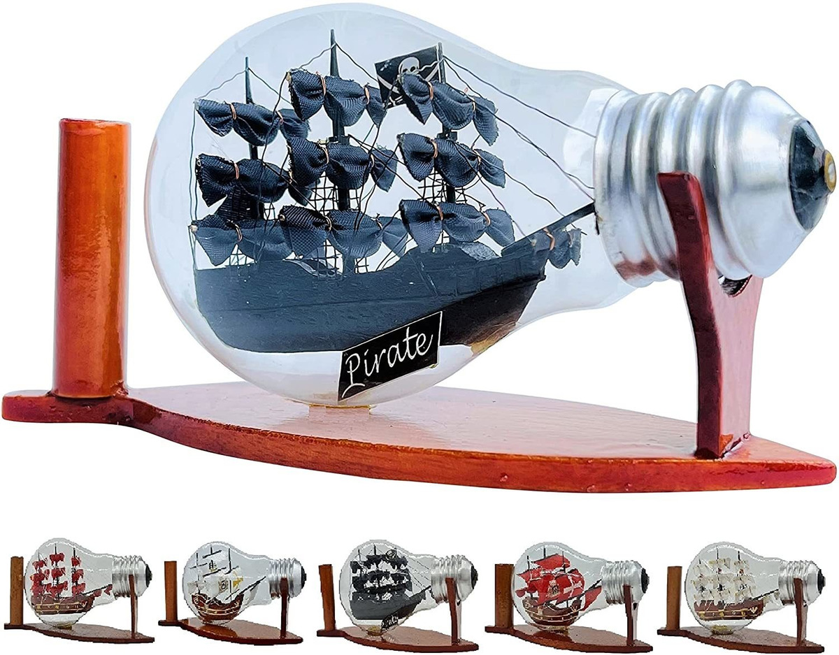El barco pirata en botella es una hermosa artesanía de madera en miniatura hecha a mano.