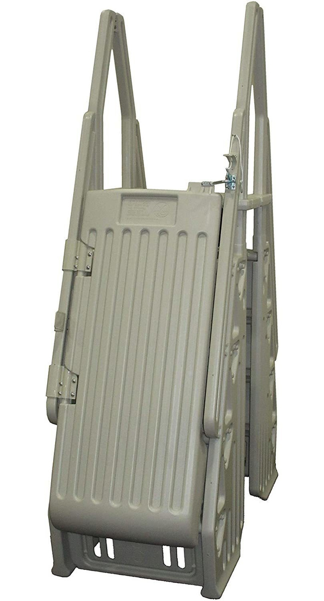 Grande 7.5 pulgadas. Peldaños profundos antideslizantes para una fácil escalada; Doble pasamanos para un agarre seguro. Es ajustable de 122 a 55.9 in con una distancia superior de 11.8 in. Con solo una huella de 22 pulgadas, esta escalera permite el máximo uso de tu piscina; Las alas antiatrapamiento garantizan que no se lastimen a los niños; Puerta con resorte y cierre automático; Exclusivo ensamblaje entrelazado a presión. Capacidad de peso: 299.8 lbs Las mejores características de un escalón de piscina y escalera se combinan para un uso seguro y fácil de su piscina en el sistema de entrada Neptune A-Frame. Este sistema de entrada súper fuerte es un híbrido entre una escalera y un escalón. Cuenta con la facilidad de escalada como un escalón con el 7-1/2 pulgadas. pisadas antideslizantes profundas, pero solo consume una mera 22 pulgadas. de espacio de natación en su piscina. El sistema de entrada está hecho de resina resistente protegida contra los rayos UV y sin mantenimiento. Los pasamanos dobles extendidos permiten a los niños pequeños salir fácilmente de la piscina, mientras que una plataforma superior protege el riel superior de su piscina. Todas las bandas de rodadura y plataforma son antideslizantes para mayor seguridad. El sistema de entrada Neptune es ajustable para adaptarse a piscinas de 48 pulgadas. a 56 pulgadas. en profundidad y cumple con todos los códigos nacionales y locales de atrapamiento. La escalera exterior tiene una puerta de cierre automático a la entrada de bar de los más pequeños o nadadores no autorizados. Las alas laterales protegen a los niños de quedar atrapados debajo de las escaleras. Todos nuestros productos estan en inglés SKU 15092108503