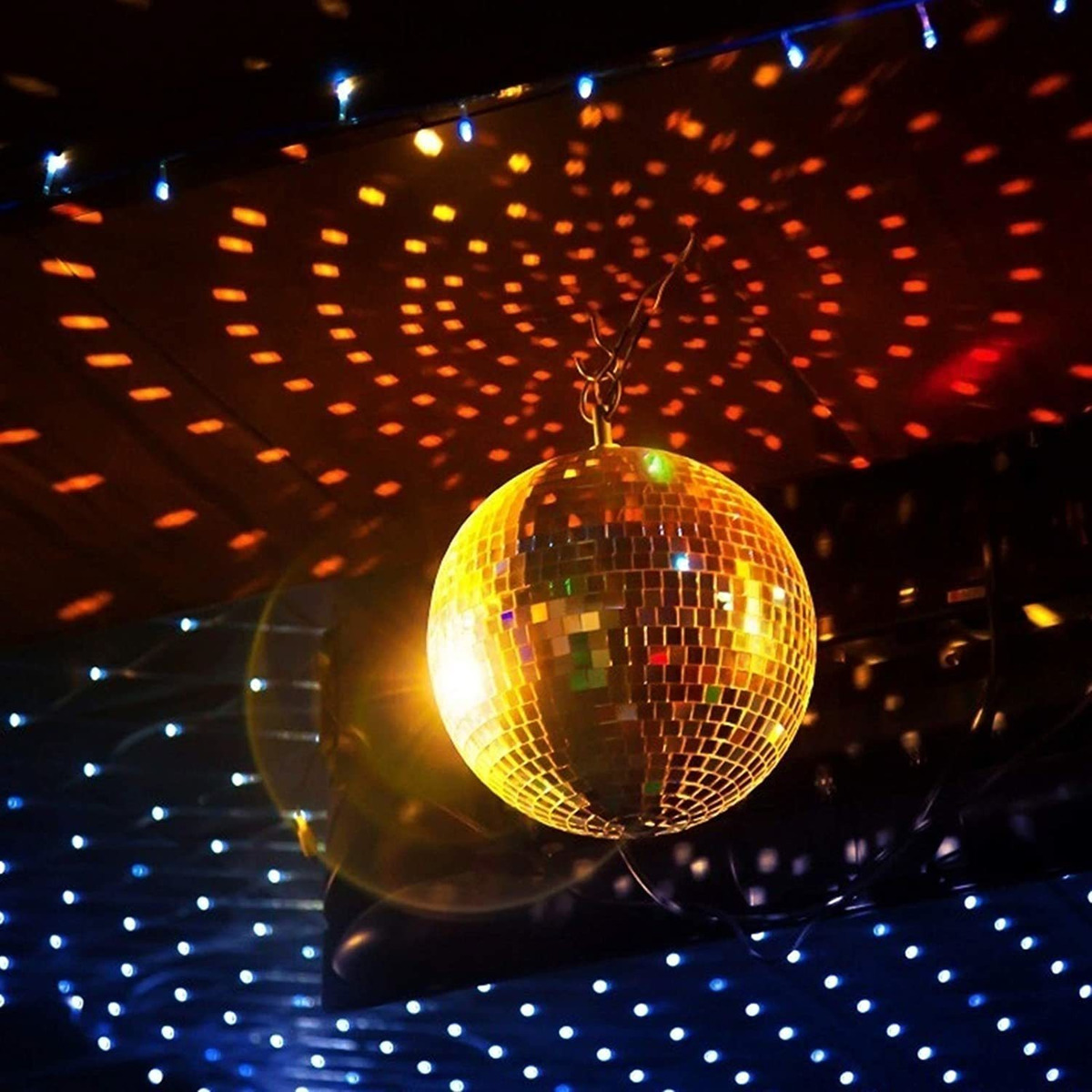 Esta es una decoración de bola de disco de oro de 7.9 in de tamaño y peso ligero. Está hecho de espuma de poliestireno cubierto con espejos dorados pulidos a mano, reflejando varias luces coloridas y lo hacen brillante si se instala con un motor giratorio. Perfecto para decoración del hogar e iluminación para fiestas temáticas de discoteca, baile y banquetes.