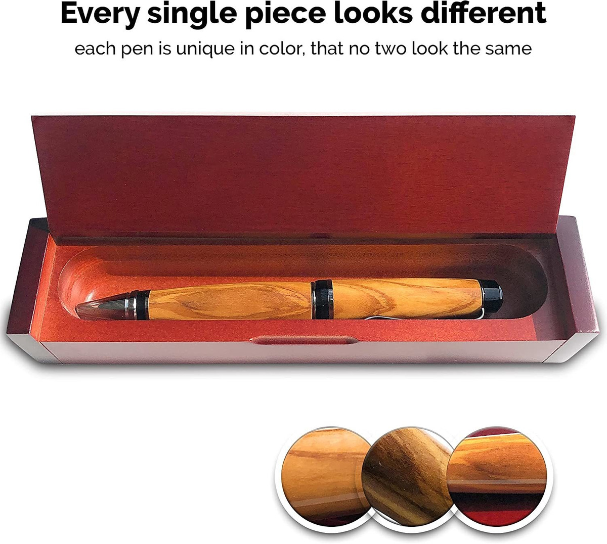 Regalo ideal: clásico y práctico objeto de arte atemporal, nuestro bolígrafo de tinta es un regalo especialmente memorable de Navidad, cumpleaños o aniversario para hombres y mujeres; Lujoso: fabricado con madera de olivo de la Tierra Santa, cada juego de bolígrafos es una obra de arte hábil y un precioso instrumento de escritura que ofrece la alegría de escribir durante generaciones venideras; Único: con el uso de madera natural, no hay dos bolígrafos iguales. Cada pieza de madera está estabilizada para un peso ideal, durabilidad y conservación de su belleza natural; Fabricado en Texas: construcción de calidad utilizando solo piezas de la más alta calidad para su durabilidad y longevidad y con la mejor tinta disponible para obtener los mejores resultados de escritura; Hecho a mano: fabricado con precisión y delicadeza utilizando materiales de calidad superior disponibles; cada uno de nuestros elegantes y elegantes bolígrafos refleja la pasión, dedicación y gran atención al detalle Todos nuestros productos estan en inglés SKU 91221059658