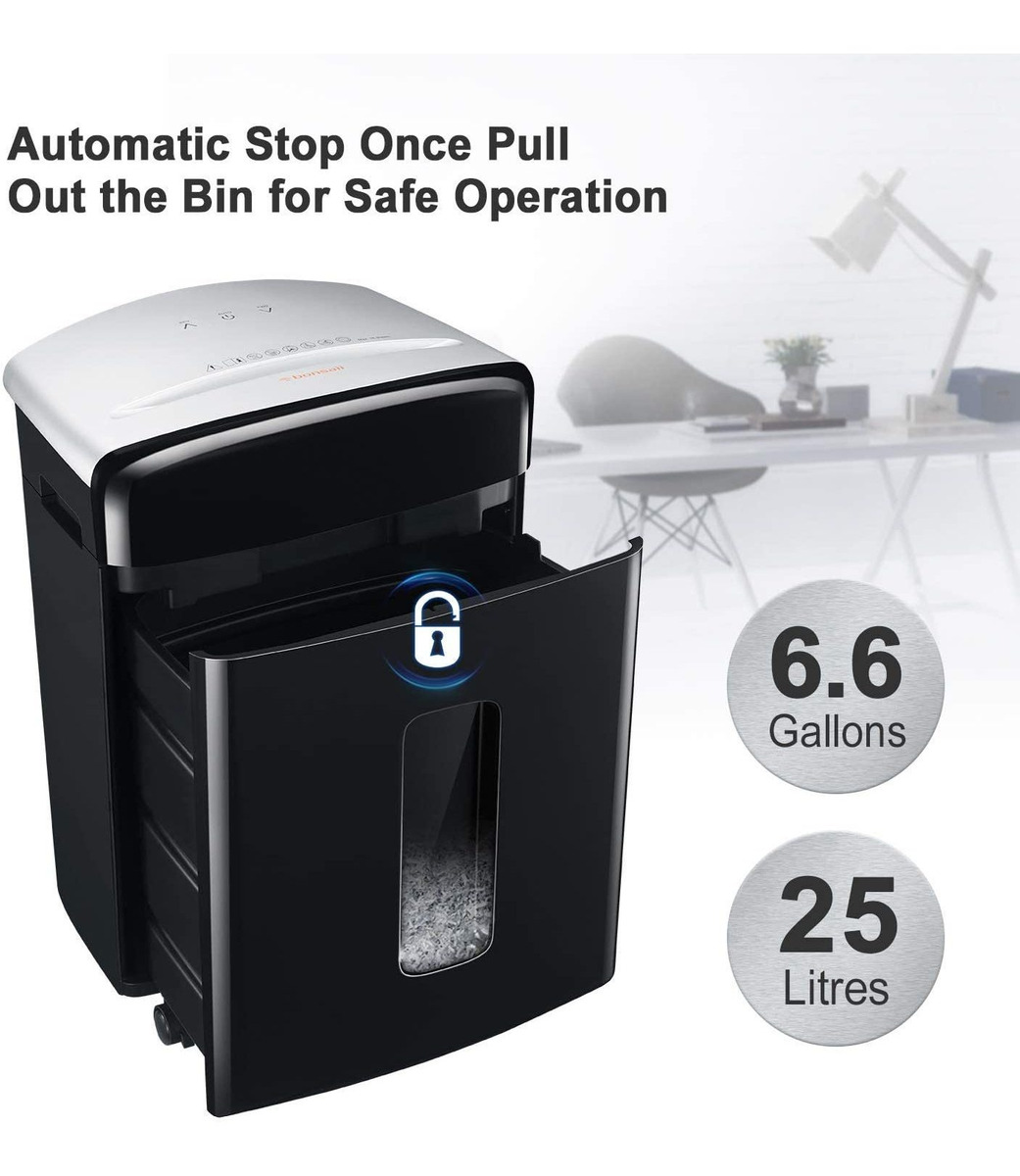 Trituradora de papel con 16 hojas (Tamaño Carta, 2,65 oz / m) de Capacidad de trituración y 0.157 x 0.472 en, Nivel de Seguridad P4; el Tamaño de trituración es perfecto para mantener tu Información confidencial segura .; Destruye papel, Tarjetas de crédito, clips, grapas .; Tiempo de Funcionamiento continuo up to 20 minutos sin parar con el Sistema de Refrigeración avanzado y la Tecnología de corte patentada; la Función de inicio automático y manual de marcha atrás te protegido de la frustracion de atascos de papel .; El Bajo Nivel de ruido de 60 dB te Dara Una experiencia de trituración suave y silenciosa y 4 ruedas para Mayor COMODIDAD en el movimiento un CUALQUIER Lugar Que desees; Capacidad extraíble de 6,6 galones PARA UN vaciado Menos Frecuente y Fácil y La Ventana transparente Hace A que sea Fácil de Ver CUANDO ESTA llena Ideal para tu oficina en casa.