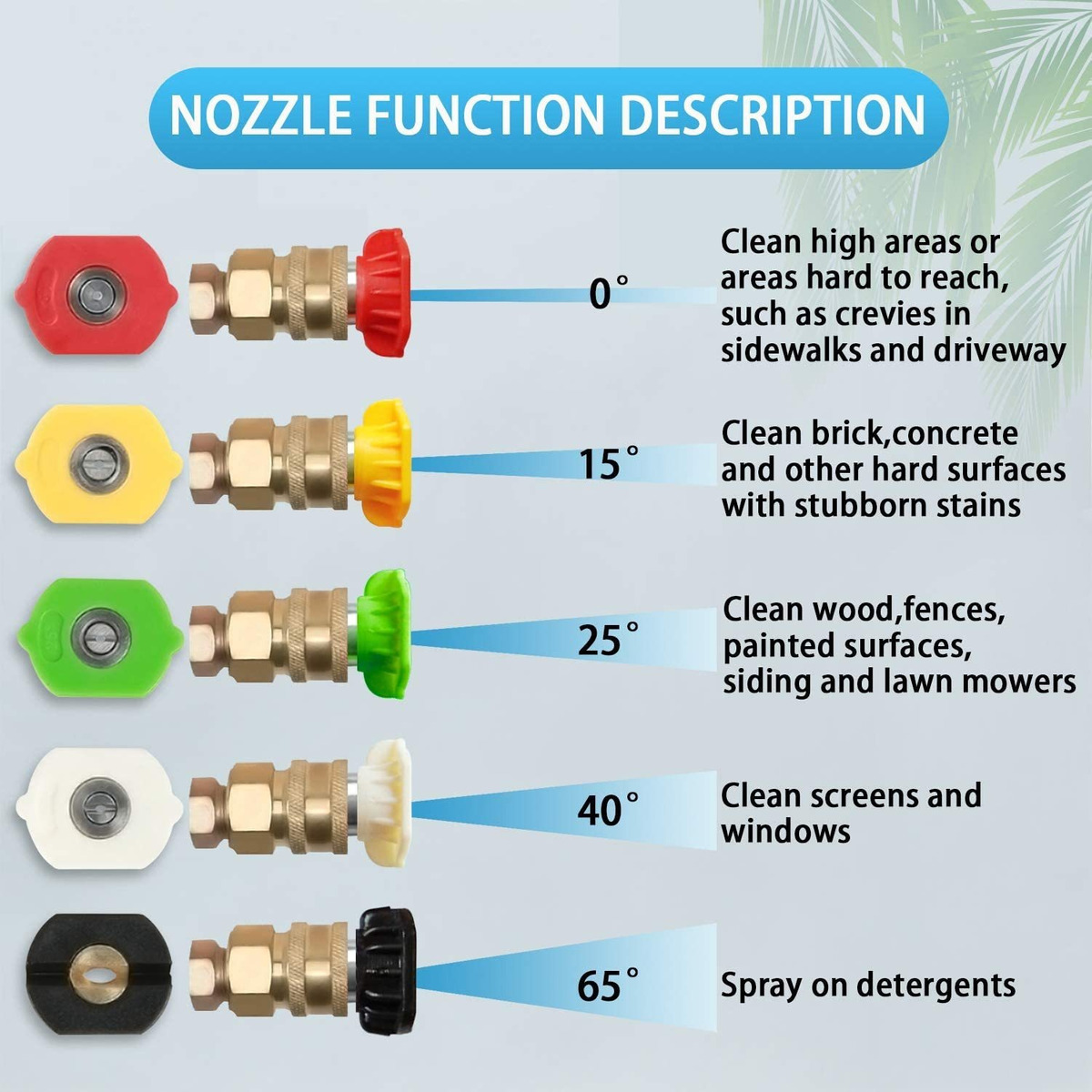 Diseño profesional de limpieza de alta presión: 5 puntas de lavado a presión de múltiples grados (0, 15, 25, 40, 65 grados) hasta 4000 PSI, puede ayudarte a limpiar fácilmente coches/bicicletas/suelos/paredes/suelos, regar césped, flores/árboles, etc. Los diferentes ángulos de pulverización te permiten limpiar rápida y fácilmente las zonas de difícil acceso.; Adecuado para la mayoría de limpiadores de alta presión: accesorios universales para limpiadores a presión se adaptan a la mayoría de marcas líderes en Estados Unidos. Es fácil de instalar y ayuda a las personas a reducir la fatiga de pulverizar y limpiar en el jardín.; Materiales de alta calidad: 5 boquillas de lavado de alta presión están hechas de latón de alta calidad y acero inoxidable con diseño de conexión rápida de 1/4 pulgadas, presión de hasta 4000 PSI, galones por minuto: (3.0 GPM), tamaño del orificio de la boquilla: 3.0, estable y duradero. Se puede utilizar en combinación con un cañón de espuma. Duradero durante años.; Función de limpieza completa: 5 boquillas de alta presión de múltiples grados que se pueden conectar a las varas de extensión de lavadora de alta presión para una aplicación más rápida y más, combina con cualquier conector rápido de 1/4 pulgadas como puntas de boquilla, acoplador giratorio, cañón de espuma, varita de extensión, propósito multifuncional.; Servicio al cliente de alta calidad: respuesta en línea dentro de las 24 horas, el equipo de DIYTOOLS solo ofrece productos de calidad. Quieres conseguir un estilo de vida más seguro, respetuoso con el medio ambiente, saludable y económico