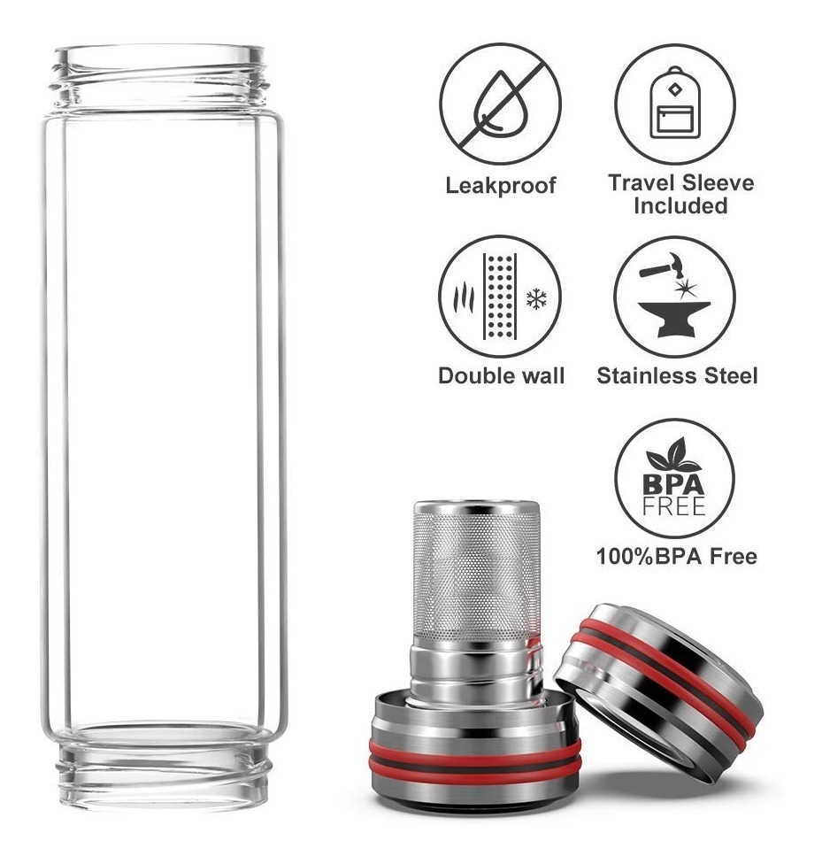 Especificaciones: Botella De Vidrio De Doble Pared Con Infusor De Té, Rojo