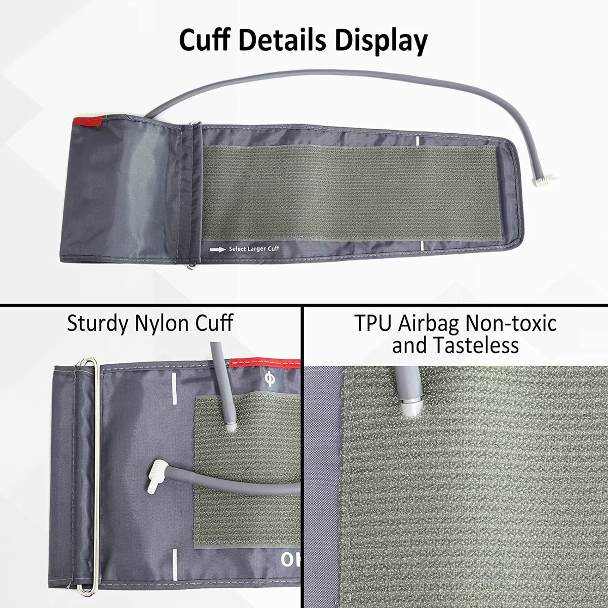 Puño grande para adultos: nuestro brazalete para monitor de presión arterial se adapta a brazos de 9 a 20.5 pulgadas (8.7-20.5 in) de circunferencia. El puño de repuesto es fácil de ajustar para mejorar la precisión.; Diseño de compatibilidad: el brazalete grande de repuesto es adecuado para el monitor de presión arterial ELERA, así como la mayoría de otras marcas. Fácil instalación y ajustable.; Material: brazo de presión arterial con tela de nailon, bolsa de aire de TPU no tóxica e insípida. Gancho suave de nailon que no agarra el cabello.; El paquete incluye: solo correa grande para el puño. No incluye monitor de presión arterial.; Servicio posventa: ofrecemos garantía para este producto, puedes ponerte en contacto con nosotros en cualquier momento si encuentras cualquier problema en el uso. Solo correa extra grande, monitor de presión arterial no incluido. Adecuado para brazo de 22 a 20.5 in. Con un anillo en D integrado, el brazalete de repuesto para monitor de presión arterial es fácil de ajustar para una mayor precisión. Cómo utilizar: 1. Mantén el borde inferior del puño de 2 a 1.2 in. 2. El tubo de aire está en el interior de tu brazo y alineado con el dedo medio. 3. El puño debe colocarse en el brazo al mismo nivel que tu corazón. 4. Mantén un cierto espacio entre el puño y el brazo. Asegúrate de que se pueda insertar un dedo. Todos nuestros productos estan en inglés SKU 4022241045