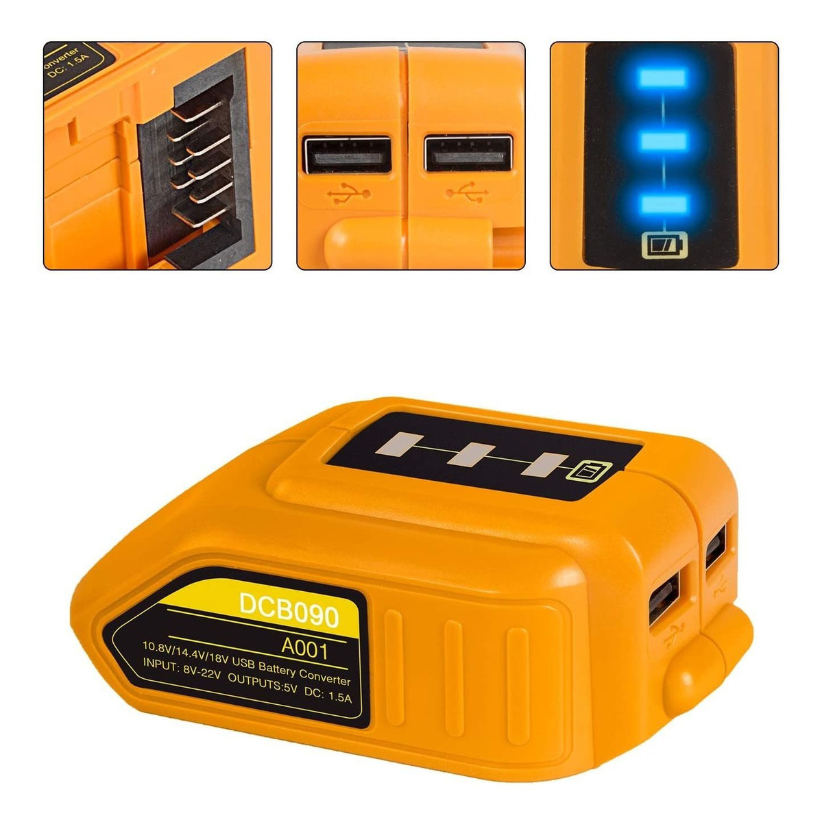 Entrada: 8-22 V, salida: 5 V, CC: 1,5 A; Portabilidad y fácil de transportar. Fabricado con ABS, peso 2.3 oz; Carga de una amplia gama de pequeños dispositivos electrónicos; Luz LED única: se puede utilizar para la iluminación cuando no hay electricidad; Compatible con baterías Dewalt 12 V 20 V MAX XR Especificaciones: