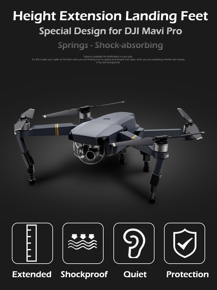 Lista del paquete: Piernas 2xLanding; 1x Support (Consulte la Imagen 1) Recepción de pies actualizados compatibles con DJI Mavic Pro; Peso: 27,6 g / juego; Altura Extionsion: Aterrizaje resbalones 5 CM Superior con muelles y silicio Pies, aterrizaje seguro, que absorbe los golpes fortalecida // adecuados para los diversos tipos de suelo, puede proteger eficazmente el cardán y la cámara, la prevención de la arena, hierba, etc entrar en la máquina; Fácil Instalación: Amortiguación elástica Struture, ajuste perfecto, fácil de instalar; Lista del paquete: Piernas 2xLanding; 1x Support (Consulte la Imagen 1) SKU 20021833026