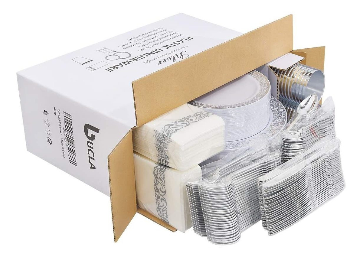 Materiales seguros: ESTOS platos desechables de plata, Cubiertos de plástico y vasos de plástico ESTÁN Hechos de plástico 100% de grado alimenticio, no tóxico, Sin BPA. Ideal para de uso diario y ayuda a proporcionar Una Vida Saludable .; Excelente diseño de encaje: el diseño fino y versátil de color lo convierten En un producto perfecto para Complementar any Esquema de color. Estós Cubiertos de plástico plateado ESTÁN Diseñados ONU de la estafa de mango de plata envejecida ornamentado Que es perfecto para combinar con Nuestros platos de plástico desechables y Tazas .; Vajilla de plástico: Cada vajilla de plástico plateado INCLUYE 50 Platos llanos, 50 platos de ensalada, 50 tenedores, 50 Cuchillos, 50 Cucharas, 50 Tazas, 50 servilletas Desechables, ideal para SERVIR a 50 INVITADOS. No importa el Desayuno, el almuerzo o La Cena, ESTOS Platos de fiesta de plástico se adaptan a todas tus Necesidades .; Diseñado para TODAS LAS Ocasiones: Los Cubiertos de plástico y los platos de plástico desechables de Plata hijo perfectos para Todos Tus Eventos Formales e informales, fiestas de cumpleaños de Como, banquetes de Negocios, fiestas de Compromiso, bodas, etc .; Gran valor: Nuestras Placas de plástico, Cubiertos desechables y vasos de plástico pueden Llevar a tu fiesta un Nivel Un Mas Alto pecado comprometer la Calidad y Fiabilidad. Increíblemente, es Asequible y Duradero. Recomendarlo al 100%. ! Color: Plateado