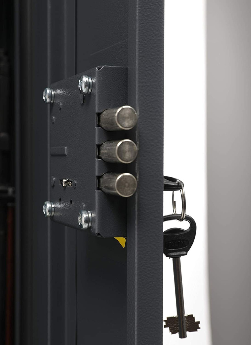 Compara las dimensiones seguras con la longitud de tu rifle; Este armario para armas viene totalmente montado. Capacidad para 3 rifles o escopeta de hasta 50.3 pulgadas de alto. Dimensiones: exterior: 52.4 pulgadas de alto x 11.8 pulgadas de ancho x 7.9 pulgadas de profundidad. Interior: 51.5 pulgadas de alto x 11.7 pulgadas de ancho x 6.5 pulgadas de profundidad. Caja de bloqueo para pistolas/munición: 8.7 pulgadas de alto x 6.7 pulgadas de ancho x 4.1 pulgadas de profundidad; La caja fuerte tiene áreas de almacenamiento separadas. La caja de seguridad para pistolas y municiones está en la parte delantera del armario. Disponibilidad de agujeros de anclaje para fijar la caja fuerte a la pared. Keylock: completo con dos cerraduras de llave. Los pernos de bloqueo proporcionan una protección avanzada contra robos Protege tu valiosa colección de armas de una variedad de elementos, incluyendo la humedad y el polvo. Este armario de seguridad para pistola de metal viene equipado con tres áreas de almacenamiento separadas que son adecuadas para guardar rifles y pistolas en sus propios compartimentos. La unidad está fabricada con dos cerraduras de llave para mayor seguridad. Cada cerradura cuenta con tres pernos de bloqueo vivo. Los pernos de bloqueo proporcionan una protección avanzada contra robos. Esta caja fuerte para armas es capaz de albergar tres armas largas de hasta 50.3 pulgadas de alto. Tiene una caja de seguridad separada que proporciona almacenamiento adicional para accesorios y municiones. Puedes mostrar este armario de almacenamiento de armas con orgullo en casi cualquier habitación de tu hogar. Es lo suficientemente delgada como para caber en la mayoría de espacios. Puedes estar tranquilo sabiendo que tus armas están guardadas de forma segura. Todos nuestros productos estan en inglés SKU 91221007736