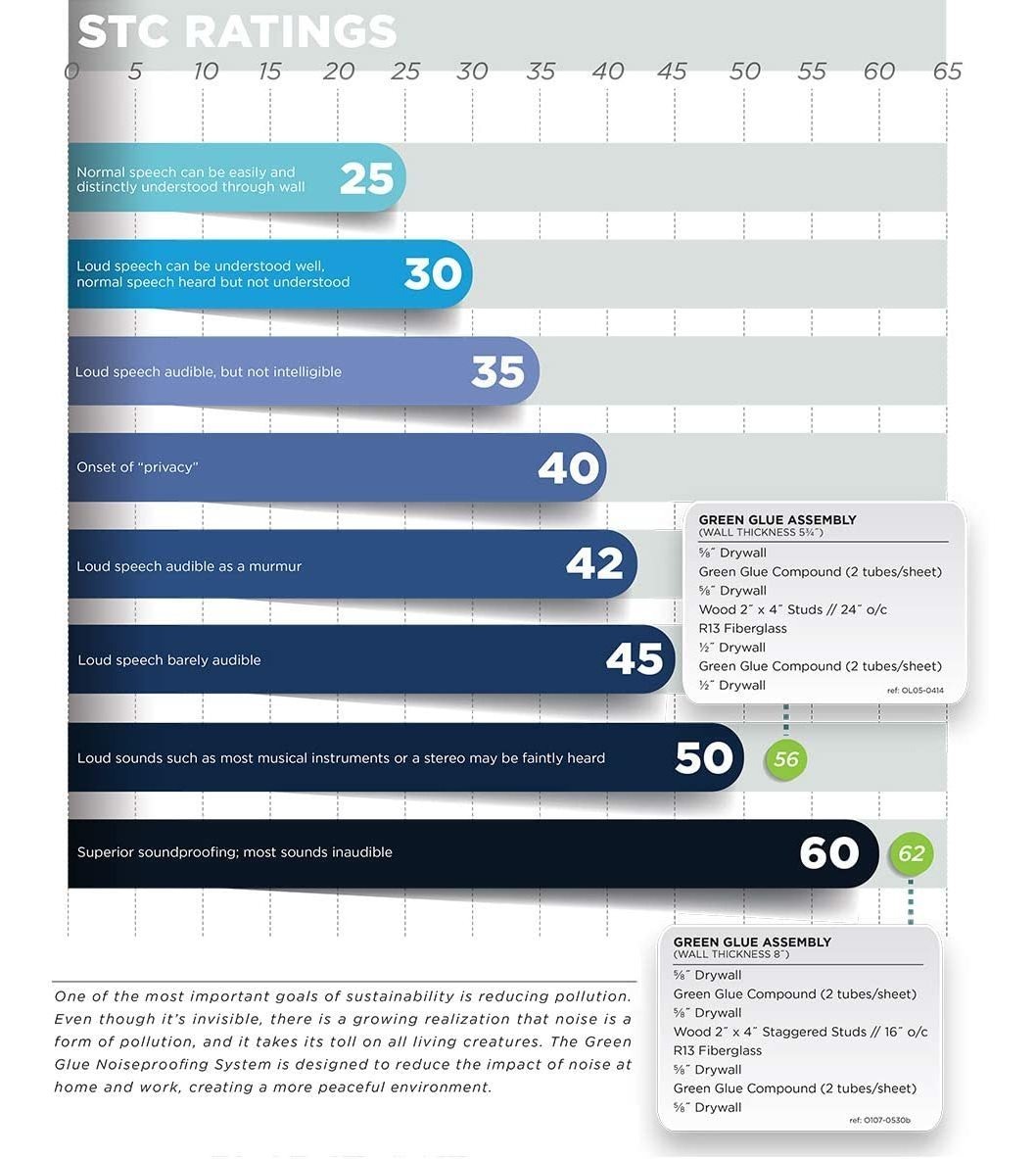 Green Glue is the simplest, most effective and affordable soundproofing product currently on the market for any sound proofing project. Green Glue can be used over any existing wall, floor or ceiling by simply adding another layer of material to reduce sound transfer. Just apply with a standard large size caulk gun in a random pattern for cost effective application. Green Glue has been tested in independent laboratories and has proven to be one the best sound proofing products available. Third party acoustical tests demonstrated a STC rating of 56 using green glue in a standard single stud wall with common drywall. Low Frequency sound isolation (not included in STC testing) was greatly improved over older techniques. Green Glue is also one of the few products that greatly reduces both, impact and airborne noise. Making it a great product for multiple family projects, hotels, offices, home theaters, recording studios, bedrooms, wood/tile floors and anywhere you want some peace and quiet. Todos nuestros productos estan en inglés SKU 91221089319