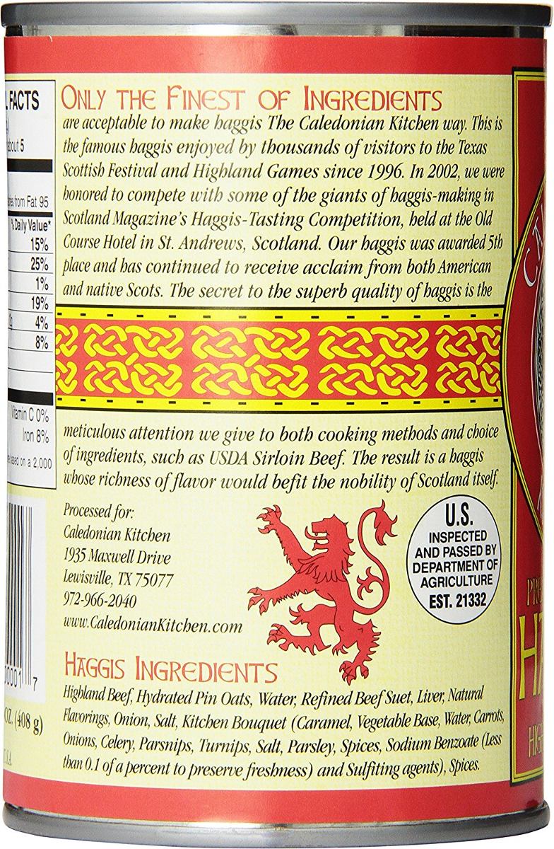 Pack de tres, latas de 14,5 onzas (total de 43,5 onzas); Privada cultiva USDA inspeccionó Beef tierras altas; Contiene Avena re-hidratado, el sebo de res refinado, agua, cebolla y especias haggis cocina con carne de Caledonia altiplano, latas de 14.5 onzas (paquete de 3) es una versión Carne USDA inspeccionado Highland crecido de forma privada de nuestra haggis. Esperamos que disfrute de nuestra oferta de lo mejor de la «raza Auld raro.» Adicional Filtrado Todos nuestros productos son de Estados Unidos SKU 3011821372