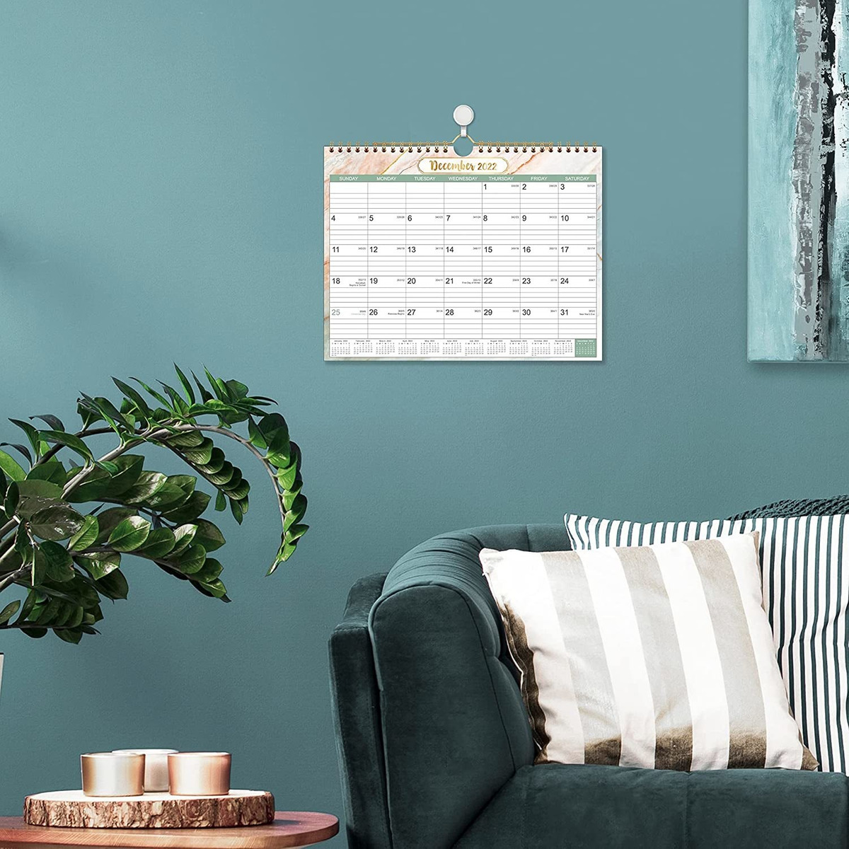 Calendario de pared 2022: calendario mensual de pared (11 x 8.5 pulgadas) que cubre desde enero de 2022 hasta diciembre de 2022. Este calendario de pared 2022 ayuda a realizar un seguimiento de tus tareas diarias y objetivos a largo plazo para que puedas hacer más en menos tiempo. Las páginas mensuales te permiten tener un mejor plan futuro.; Bloques forrados suficientes: cada bloque es de 1.5 x 1.2 pulgadas, los grandes bloques diarios rayados ofrecen un montón de espacio suficiente para horarios. Las fechas julianas y las fiestas importantes destacadas ayudan a recordarte cada fecha importante y gestionar tu vida de manera eficaz.; Papel de alta calidad: este calendario de pared 2022 está diseñado para evitar que la tinta se desvanezca y se filtre; el papel grueso de primera calidad evita que la tinta pase de manera eficaz. Páginas de calidad de archivo hechas de papel sin ácidos, resistentes a los daños por la luz y el aire.; Encuadernación de alambre resistente: la encuadernación resistente de doble alambre hace que sea fácil girar páginas y permite que este calendario de pared 2022 se cuelgue en la pared de forma constante.; Haz tu vida más productiva: herramienta perfecta para hacer tu vida eficaz. Utilizando este calendario de pared 2022, puedes pegar notas, ideas, reuniones, citas y otras tareas importantes. Todos nuestros productos estan en inglés SKU 91221062124
