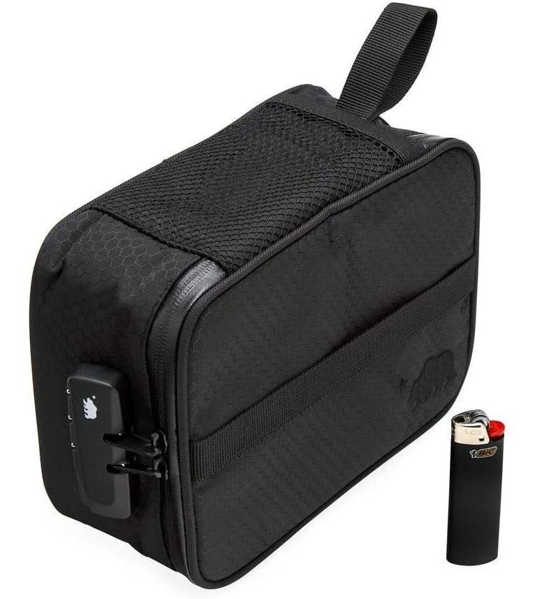 100% a prueba de olores, carbón Activado .; Materiales Resistentes a la intemperie .; Cerradura de Combinación párrafo Máxima Protección .; 3 separadores de velcro – Creación de 4 compartimentos .; 4 bolsillos de Almacenamiento De Malla, Fácil compañero de Viaje con 2 asas. Color: Negro / Blanco