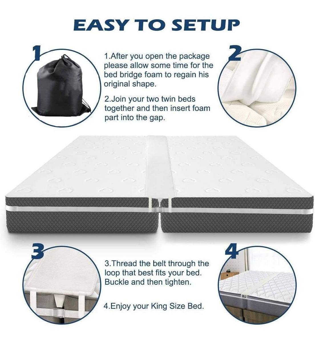 Cama Conector Kit Incluye almohadilla de espuma de memoria superiores de la calidad con 78.7 (L) X6.3 (W) pulgadas hipoalergénico tela de superficie en la parte superior, correa de 33 pies de largo cama para mantener las camas apretados juntos y una bolsa de almacenamiento, simplemente ruede cuando no está en uso.; Actualizados dos correas Dos correas de prácticas en el borde de cada lado, para ayudar a mantener el puente de la cama en su lugar, que no se caiga en la grieta de la cama. 2 pulgadas de la correa de cama de ancho, es más durable que otros .; Proteger su colchón Llenar las lagunas no sólo crea confort, sino que también protege los bordes de los colchones con una distribución equilibrada del peso. Ideal para habitaciones, B B, pensiones y alquileres de vacaciones .; Configuración Fácil de poner las dos camas juntas, utilice el teclado para llenar la brecha entre los colchones y rodear las camas con la correa incluida para que sean apretados. Hacer un rey cama en minutos .; Satisfacción garantizada su comodidad y satisfacción es nuestra principal prioridad. No estás satisfecho por completo Envíenos un correo electrónico y nosotros haremos todo lo posible para solucionarlo. Color blanco