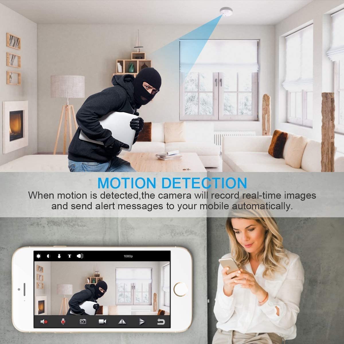 Configuracion de cámara oculta espía nueva Actualizada 1920 x 1080 píxeles del sensor retroiluminado. El diseño realista de la forma del detector de humo, nadie NOTARA Que Una Cámara una ONU similares detector de humo ESTA TODO viendo .; Nueva Actualización de visión nocturna: Las Cuatro luces infrarrojas proporcionadas por la Cámara espía soportan el control Un Mas claro en la noche. Estas luces infrarrojas especiales El hijo Completamente invisibles para el ojo humano, por Lo Que Tienes Que no preocuparte de Quién entra en tu habitación por la noche .; Deteccion de movimiento: Cuando Se Detecta movimiento, la Cámara enviará Una alerta a tu Teléfono o Correo electrónico (need configurarlo Primero). Con Grabación de vídeo en vivo, Este gadget mini grabará fielmente las Acciones de tus invitados no invitados y Se Puede Como utilizar Como Proveedor de Pruebas PARA UN USO alcalde en Caso de accidente .; Visión Remota de ultra clara y Grabación de Tarjeta SD: Despues de Configurar la Cámara espía de humo para ConectaRSE a la interior de color rojo de 2,4 GHz, PUEDES ver la fiesta de vídeo en Línea en CUALQUIER Lugar. La Aplicación en Línea y el Almacenamiento automático de Tarjetas SD te protegerá a ti y tu Familia de un 7 x 24 horas. Una compra Ahora Cámara de humo para Proteger su Seguridad. Ten en Cuenta Que DEBIDO a la Política de Amazon y La ley de los Estados Unidos, las Grabaciones no incluídas estan .; Instalación y carga: Una Vez Que Lo fijes al techo, heno dos Maneras de cargar: 1. Si hay circuito en tu techo, PUEDES mantener la Cámara cargando. 2. Si no hay circuito, PUEDES atornillarla de la Cubierta Trasera. Solo FIJA La Cubierta trasera en el techo. Y Dos heno Tornillos en el paquete. No un: