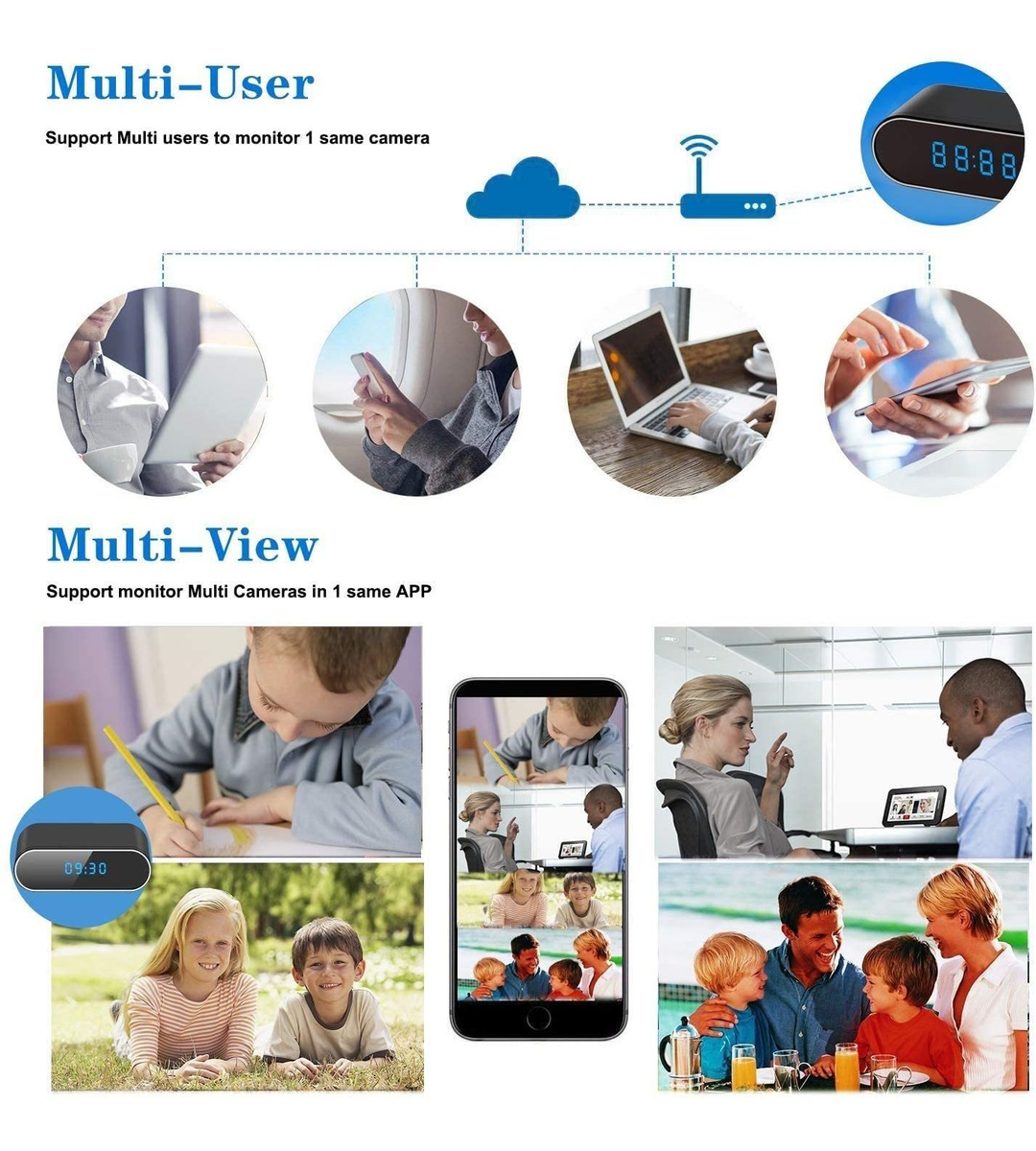 Cámara espía de 1080P con visión nocturna de gran angular de 140 . Este Reloj Oculto Adopta Lente invisibles HD 1080P y IR LED de 940 nm, lo que hace Que la visión nocturna invisible mar. Funciona con la Mayoría de los Dispositivos Que utilizan Android, Apple (iPhone / tableta) y de Windows. Aplicación Gratuita disponible para descargar .; Cámara de Seguridad Inalámbrica con alarma de detection de movimiento. Este Mini reloj de cámara oculta Soporta alertas de alarma de movimiento en Tiempo real. CUALQUIER persona en la zona de Vigilancia, tu Teléfono Rápido recibira ONU Mensaje .; Cámara Inalámbrica Controlada por Aplicación con o sin router WiFi. Si Quieres Transmisión en vivo from any Lugar, need this Configurar Cámara Conectada con el router WiFi. Pero Una Vez Que El router WiFi no is available, PUEDES todavía Como utilizar el Móvil para ver cerca (Amplio ABIERTO 98,4 pies) Conectando El Teléfono con el wifi Integrado de this Cámara .; Camara de niñera Múltiples Usuarios estafadores compatibles. This Cámara espía Wi-Fi Puede Ser supervisada por 4 Usuarios: Al mismo tiempo. Mamá, papá, abuelo y abuela Todos Pueden Cuidar del Bebé Por Su telefono Android, iPhone, iPad y PC .; Batería de litio de 2200 mAh Integrada (Incluida). El reloj de la Cámara PUEDE funcionar 5 horas Despues de v cargarse Completamente. Si Necesitas ininterrumpido espionaje de la ONU, mantenlo Conectado (cable incluido USB). Copia de Seguridad Tarjetas soporta locales micro SD de clase 10 de Hasta 128 GB (Tarjeta SD no Incluida). Características: Otras