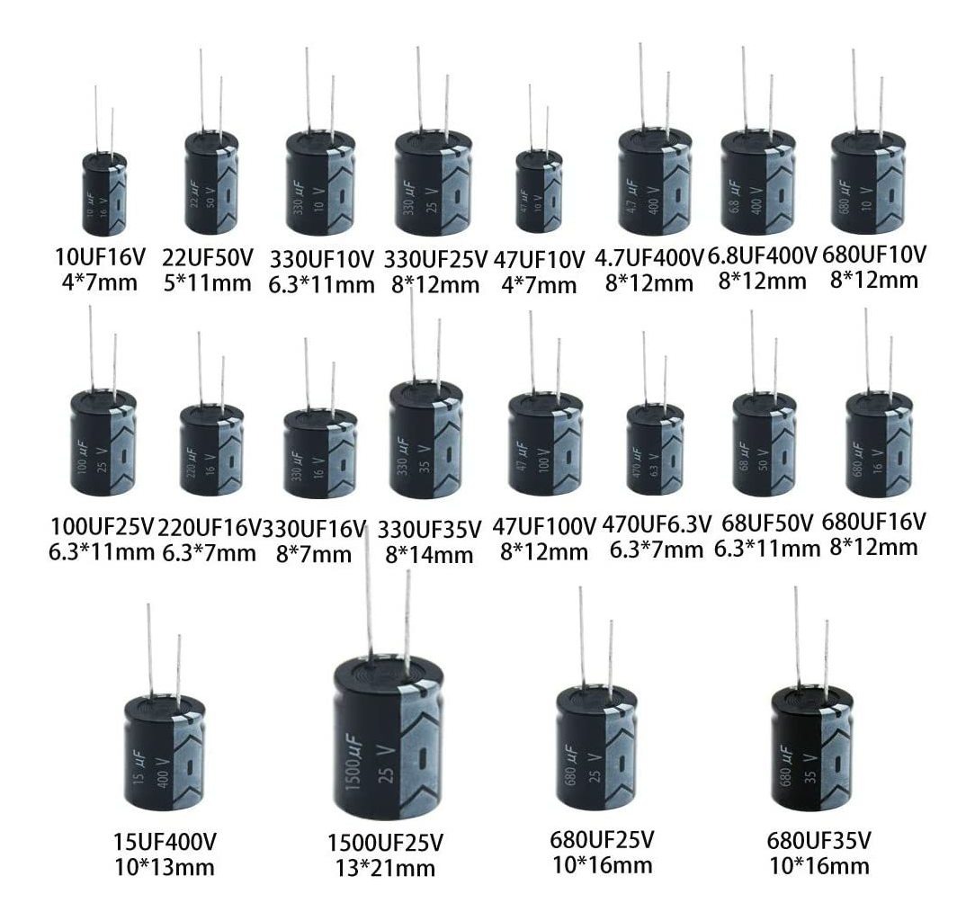 Este kit de Condensadores electrolíticos Cubre los Valores de capacitancia Más comunes,