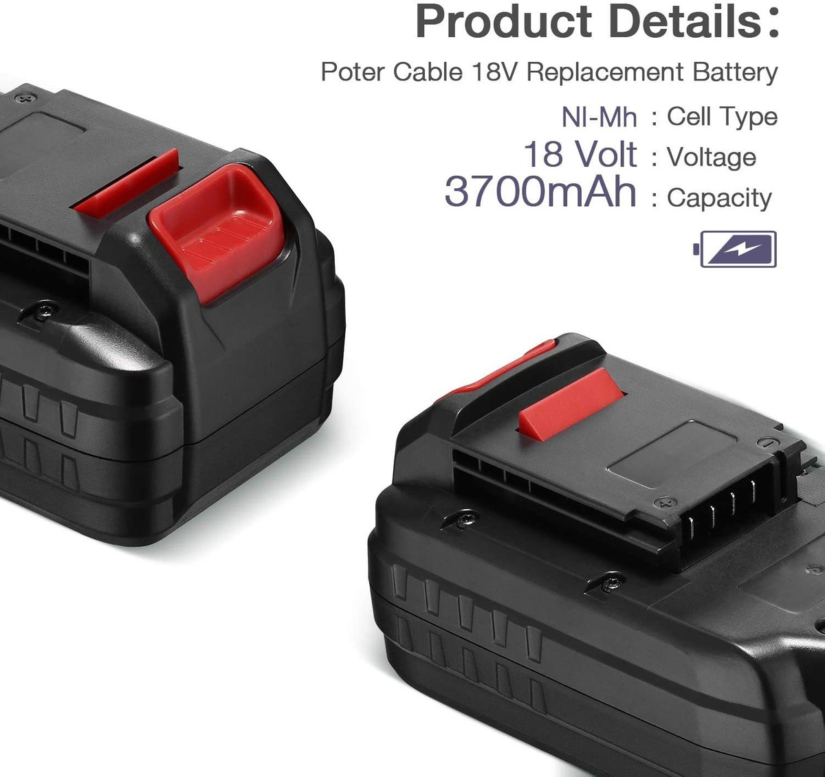 Recargable, 18 voltios, actualizado 3700 mAh, 66,6 Wh. Batería de repuesto compatibles profesional con Porter Cable PC18B. Alimenta TODAS LAS Herramientas eléctricas Porter-Cable de 18 V; Celdas de batería de Grado A, microchip integrado integrated Que evita la sobrecarga y la autodescarga; Repuesto para cargador de Bateria PORTER-CABLE 18 V MAX. Entrada de 100 – 240 V enchufe de los EEUU para Porter-Cable 18 V MAX Iones de litio y Ni-Cd y Ni-MH Batería; El Programa de Diagnóstico Integrado del Cargador comprueba las Baterías con Cada carga, las Baterías de litio de 2,0 Ah sí Cargan Completamente en 1 hora o Menos; Los Productos ESTÁN certificados por la CE, probados Y validados Por El Fabricante para igualar o Superar las Especificaciones de los Productos OEM Porter Cable PC18B. Batería de repuesto Ni-MH de 18 V cable para Porter PC18B