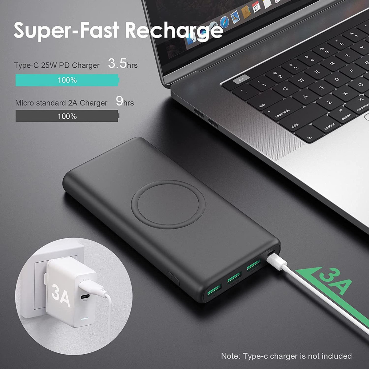 Cargador portátil inalámbrico 2 en 1: el producto se caracteriza por la carga inalámbrica (5 W, 7,5 W, 10 W y 15 W máx.), puede cargar rápidamente la mayoría de dispositivos habilitados para Qi como una fuente de alimentación recargable de gran capacidad, y también puede ser una almohadilla de carga inalámbrica rápida de alta potencia, elimina la vergenza de olvidar el cable.; Carga de alta velocidad: este paquete de batería de alta capacidad entrega de potencia 4.0 salida y carga rápida 4.0, puede dar a tus teléfonos o tabletas un potente cargador de hasta 25 W. La carga rápida puede hacer que la energía del teléfono hasta 100% completamente en 30 minutos, y puede ajustar automáticamente la entrega de energía para diferentes dispositivos.; Alta capacidad de 33800 mAh: este paquete de batería puede ofrecer 5 salidas de carga simultáneas: 1 QC 4.0 5A (tipo C) 1 PD 3A 2 USB 2.1A 1 salida inalámbrica (15W Max), y entradas duales. Batería externa totalmente que puede cargar tu iPhone 12 de 8 a 10 veces. Ideal para salir de casa o de viaje.; Menos tiempo de carga: batería integrada de gran control inteligente IC y polímero de litio de alta calidad, esta batería portátil se cargará completamente en 3,5 horas con cable tipo C y cargador PD de 25 W. Material ABS duradero que protege tu teléfono de sobrecarga, sobrecalentamiento o cortocircuito.; Detalles del paquete: el paquete incluye 1 cargador de teléfono de 33800 mAh 1 cable micro USB 1 manual de usuario (idioma español no garantizado). Ofrecemos 24 horas de servicio en línea, cualquier pregunta, por favor póngase en contacto con nosotros. Todos nuestros productos estan en inglés SKU 91221079740