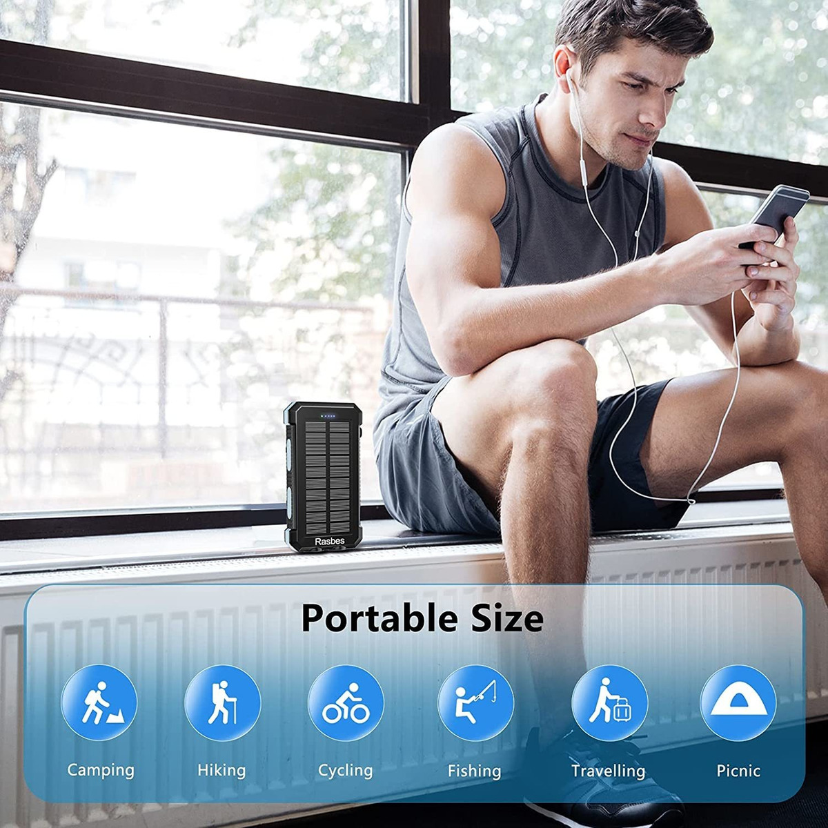 Cargador solar de 30000 mAh: Demasiado difícil encontrar el cargador solar perfecto para acampar al aire libre Este cargador solar se adapta perfectamente a tus necesidades. Batería solar integrada recargable de polímero de litio de 3000 mAh, lo que hace que sea más que un banco de energía de alta capacidad, también un cargador de batería solar. Lo mejor para cualquier actividad al aire libre.; Carga USB recarga solar: innovadora técnica de recarga bidireccional incorporada, carga la batería solar a través de entrada USB o panel solar. Un cargador de batería solar portátil para todas las emergencias. Di adiós a la ansiedad de carga de dispositivos. (La eficiencia de recarga del panel solar estará sujeta a condiciones naturales y otros factores al azar, por favor, mantenlo como una opción de recarga de emergencia); Carga rápida e inteligente: equipado con dos salidas USB de 5 V/2,1 A, carga rápida dos dispositivos simultáneamente. La técnica actualizada proporciona protección de seguridad inteligente, evita sobrecorriente, sobretensión, sobrecarga y cortocircuito, etc. Certificado por las autoridades de certificados CE, FCC y RoHS.; Función de camping 4 en 1: equipado con 5 indicadores LED (pantalla de carga de batería), 2 luces LED brillantes (3 modos de luz), 1 brújula de soporte (guía de dirección de la suciedad) y 1 mosquetón colgante (colgador de cargador solar).; Calidad duradera y reemplazo garantizado: el cargador solar Rasbes está hecho de material premium, diseñado con capacidad impermeable, a prueba de golpes y polvo. El mejor banco de energía solar para camping, ciclismo, pesca, viajes, senderismo, etc. Nuestra marca garantiza servicio de reemplazo para cualquier defecto de producto. Todo para los entusiastas del aire libre Todos nuestros productos estan en inglés SKU 91221081190