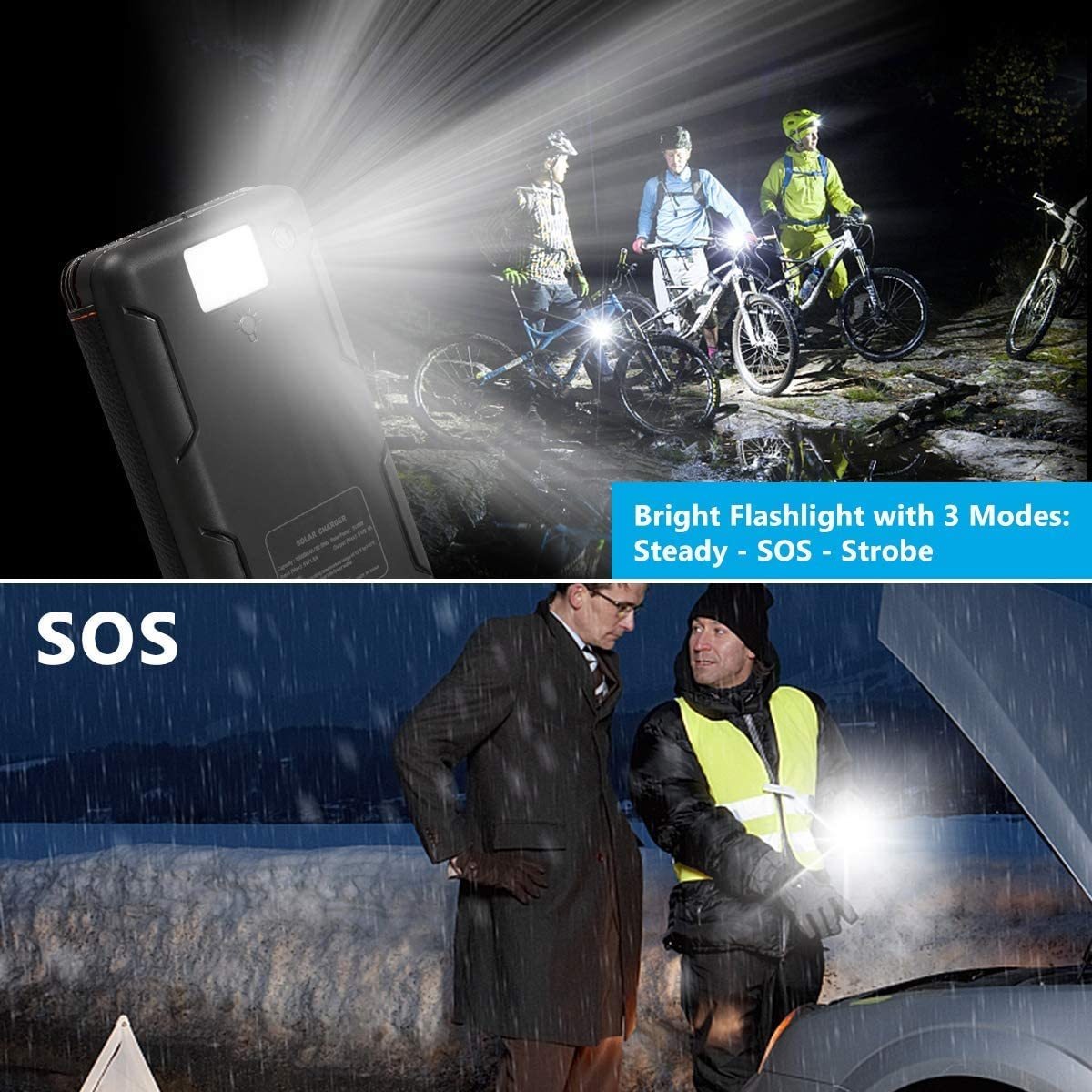 24000 mAh de alta capacidad: Con alta capacidad, ideal para 10 días de viaje.; 3 paneles solares: Tiene 3 paneles solares.; USB 2.1A doble: Puede cargar dos dispositivos simultáneamente.; Linterna: Potente linterna con modo de emergencia SOS. Todos nuestros productos estan en inglés SKU 91221081784
