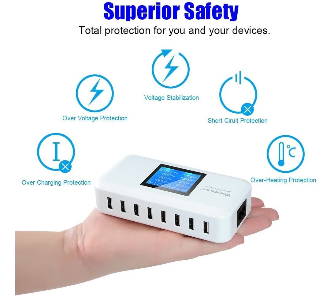 Salida de potencia de 60 W para 8 puertos, la estación USB puede cargar cualquier combinación de smartphones, tabletas u otros dispositivos con carga USB.