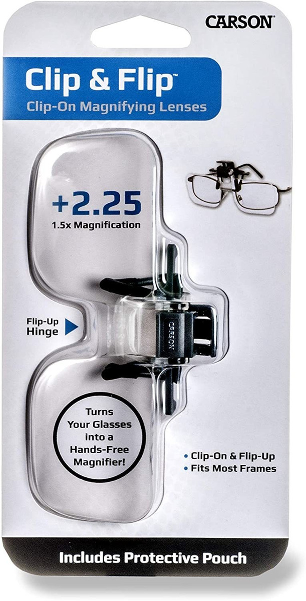 Lentes de Aumento con clip, abatibles (SE enganchan un tus gafas normales); Gira Hacia Arriba Fuera del camino; se desliza Hacia abajo para Convertirse En Una lupa Manos Libres; Ideal para atar moscas O CUALQUIER USO Otro de lupa Manos Libres; Lentes de Aumento perfectas para manualidades, afición, lectura, construcción de Modelos, Diseño de joyas y Otras tareas de Baja Visión | Bolsa protectora Incluida; 1,5 Veces de Potencia Equivalente a 2,25 dioptrías Viene incluido con Una bolsa. En Carson, nos esforzamos por asegurarnos de Que Nuestros Clientes esten 100% satisfechos con la Calidad de Nuestras lupas. Estamos seguros de bronceado Nuestras lupas Que las respaldamos con Una Garantía limitada de por vida. Carson reparará o reemplazará su lupa si SE Encuentra Que Tiene Defectos de fabricación en Materiales o mano de obra. Pongase en contacto con Carson párrafo Obtener Más Detalles de la Todos nuestros productos estan en inglés SKU 12062116923