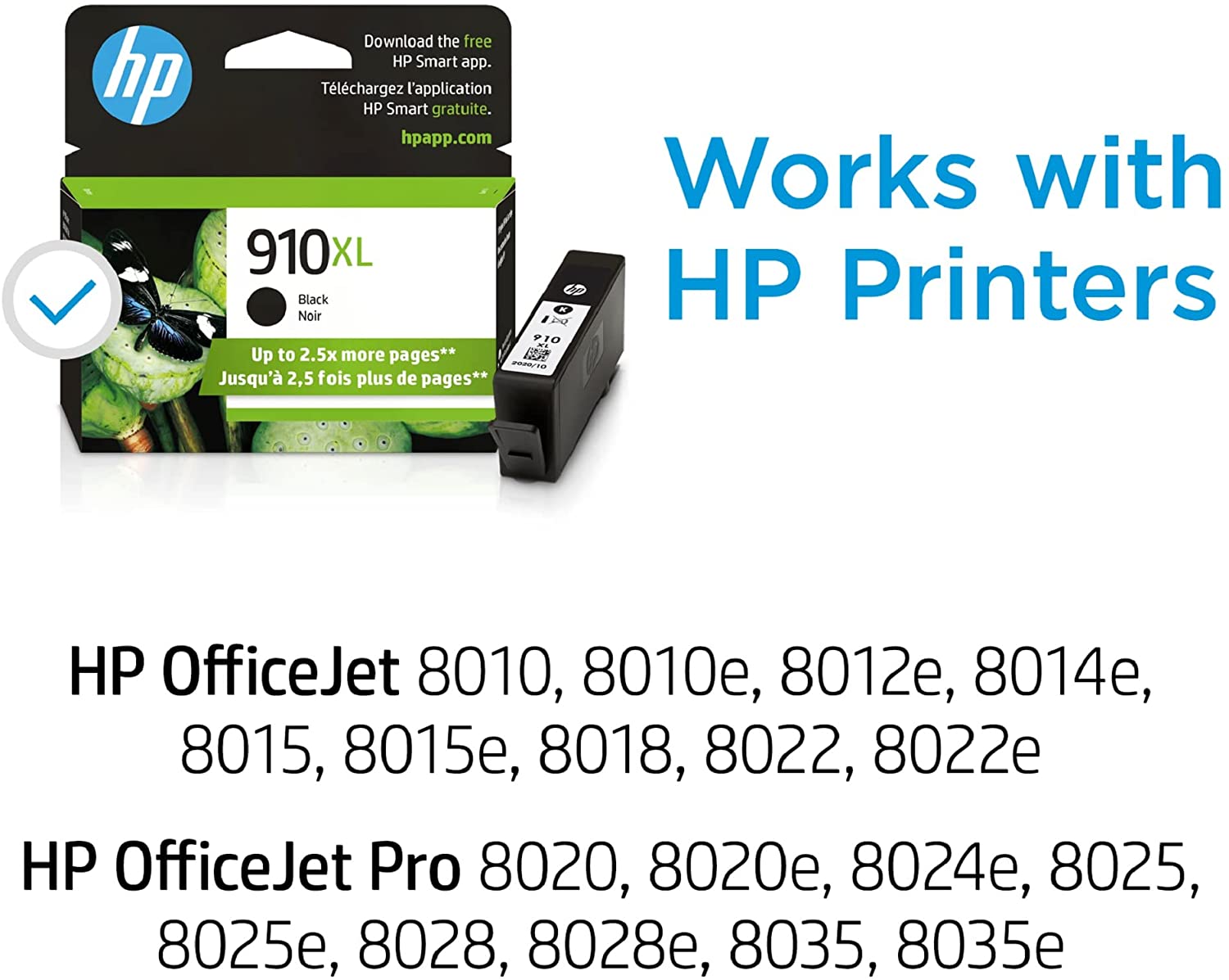 Especificaciones: Cartucho de tinta negra original HP 910XL de alto rendimiento | Funciona con HP OfficeJet 8010, 8020 Series, HP OfficeJet Pro 8020, 8030 Series | Elegible para Instant Ink | 3YL65AN