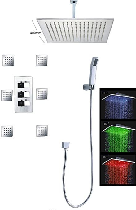 Regadera de baño cuadrada párrafo llevado USO continuo de azul el color, plomo, verde y rojo .; Todos los accesorios del juego de regadera hijo Como Se Muestra En la imagen (Incluida la Válvula mezcladora áspera) ESTÁN Incluidos en el paquete .; Regadera de baño, Alimentación LED por presión de agua, el pecado s necesidad de Bateria. Cambia de Color detectando La Temperatura del Agua. Construcción de acero inoxidable 304 para Fiabilidad y Rendimiento Duradero. Acabado chapado en metálico Fácil de Limpiar Que resiste años de USO MIENTRAS Mantiene su belleza .; Producto de 5 años de Garantía .; Las Conexiones de la Válvula hijo NPT 3/4 -.. Estándar de EE UU Todas las Conexiones de rosca NPT hijo -. Estándar de EE UU. Tamaño: 16 Pulgadas | Color: bronce aceitado