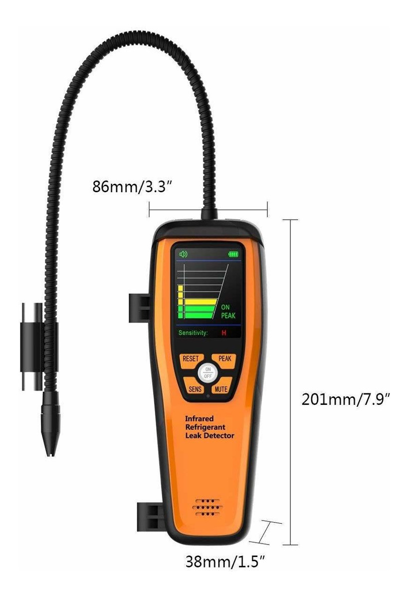 Con el sensor de infrarrojos última y más innovados, la vida del sensor se extiende enormemente durante un máximo de 10 años. Se dispara sobre todos los refrigerantes halogenados mucho más precisa que sensor corona tradicional y sensores de calor-diodo moderados .; 3 niveles seleccionables de sensibilidad -Alta / medio / bajo; Con una sensibilidad máxima de hasta 0,14 oz / año .; detector de fugas avanzado primera pantalla TFT del mundo anima fugas, la sensibilidad, los niveles de batería y sensores indicadores defectuosos y presenta lecturas más claras y fáciles .; Al pulsar el botón PEAK para marcar el valor máximo de fuga durante las mediciones .; Responde a todo tipo de refrigerantes halogenados y cumple con EN14624, SAE-162, SAE-2791 y las normas SAE-2913. ¿Devolución o cambio dentro de los 3 meses + 3 años de garantía gratis !!!¿ Todos nuestros productos estan en inglés SKU 6081934779