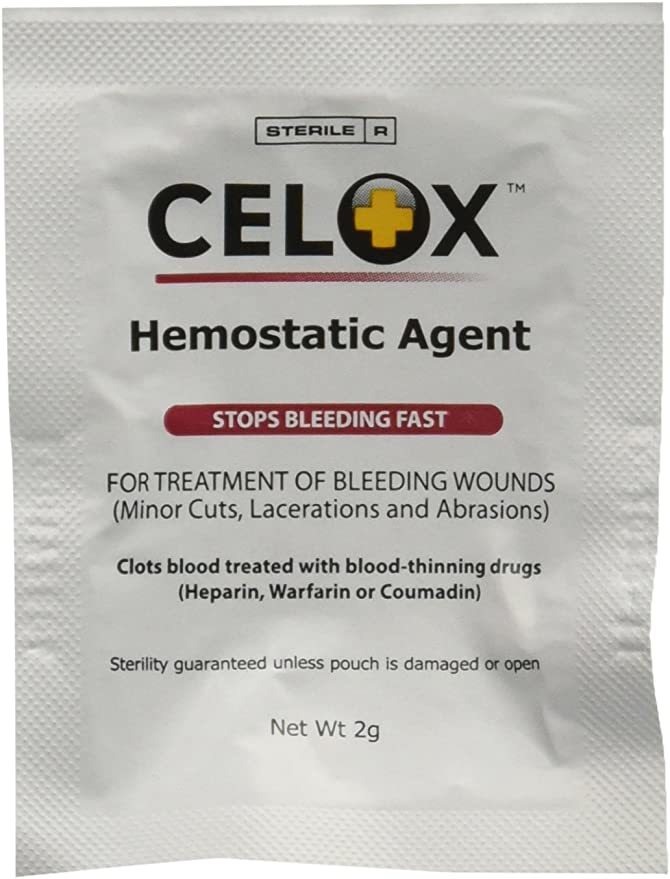 Usted puede confiar en CELOX para detener el sangrado cuando más lo necesita sin generar calor .; CELOX es fácil de usar (sólo verter, empacar y aplicar presión), muy seguro y extremadamente eficaz. Cuando se mezcla con la sangre, Celox forma un tapón de gel sólido en 30 segundos .; Reducir significativamente la pérdida de sangre y detener la hemorragia, incluso arterial. Salva vidas; Esta acción coagulante es independiente de los órganos de los procesos de coagulación normales. la capacidad de coagulación de CELOX se ha demostrado que funciona en presencia de anticoagulantes como la warfarina comunes .; Rápido, seguro, eficaz y asequible-CELOX es ideal para mascotas, caballos y ganado también la vida de ahorro de coagulación de la sangre producto disponible para el hogar, el trabajo, la escuela, y el juego. Usted puede confiar en CELOX para detener el sangrado cuando más lo necesita. CELOX funciona en todas las heridas sangrantes; de cortes y rasguños de menor importancia, a heridas graves. CELOX es fácil de usar (sólo verter, empacar y aplicar presión), muy seguro y extremadamente eficaz. Cuando se mezcla con la sangre, Celox forma un tapón de gel sólido en 30 segundos. Esta acción coagulante es independiente de los órganos de los procesos de coagulación normales. la capacidad de coagulación de CELOX se ha demostrado que funciona en presencia de anticoagulantes como la warfarina comunes. Probado por los EE.UU. Marina en Jacksonville, CELOX fue el único producto para garantizar la supervivencia del 100 por ciento. Ha demostrado ser efectiva originalmente desarrollado para ayudar a los médicos militares, CELOX proporciona una rápida, primeros auxilios eficaz para hombres, mujeres, niños y adultos mayores, y es fácil de usar, incluso si usted no tiene primeros auxilios o la formación médica. CELOX Incluso se ha demostrado que funciona en el frío (en casos de hipotermia). Este agente de coagulación de la sangre que puede salvar vidas está disponible en dos tamaños convenientes, tres y seis paquetes de paquetes de 2 gramos. CELOX primeros auxilios granular verter directamente sobre una herida y aplicar presión – no puede arder o picar. Sangrado típicamente se detiene dentro de los 30 segundos. Una herramienta imprescindible para cada kit de primeros auxilios CELOX productos de primeros auxilios son fáciles de llevar en su bolso, maletín, mochila, bolsa de deporte, en la guantera, caja de herramientas, o caja de pesca. Todos nuestros productos estan en inglés SKU 4032114553