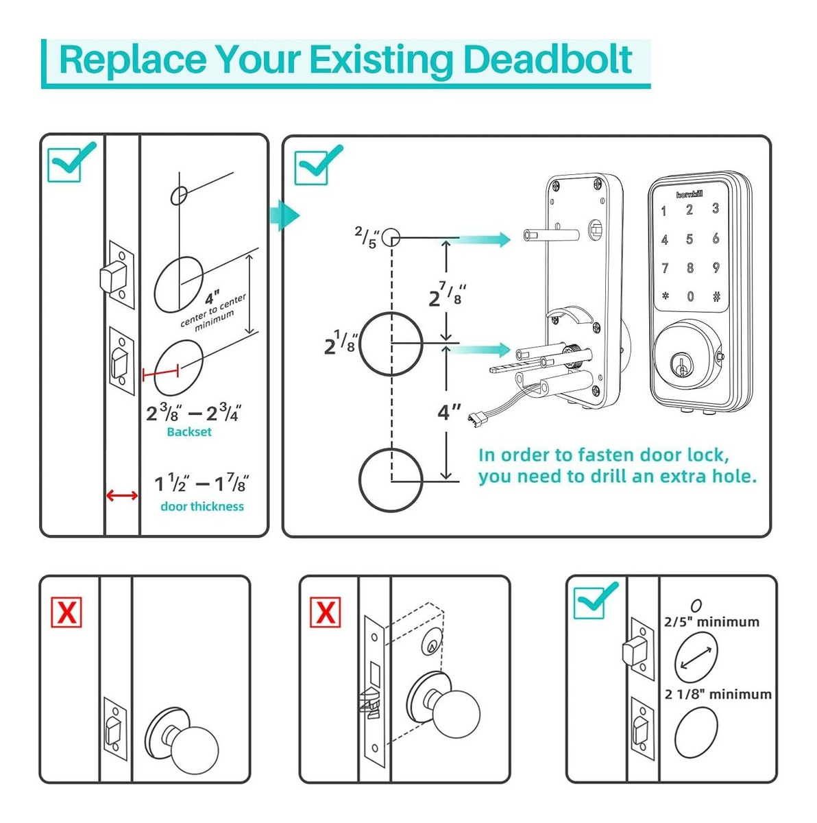 Control de voz: añade un puente Wi-Fi (se vende por separado) para bloquear/desbloquear y monitorear de forma remota, tu puerta y también para integrar con Alexa para permitir el control de voz.; Longer Lifespan More Reliable: Both the front and back panel of this Smart Digital Door Locks are made of Zinc Alloy, Anti-impact suitable for harsh environments. ( Waterproof Level: IP65; Operating Temp Range: -2050 ); Cerradura de puerta de entrada sin llave: bloqueo y desbloqueo con smartphone, teclado y llave mecánica. Controla el acceso sin llave y mantén un seguimiento de quién viene y va, todo desde tu teléfono. Tendrás comodidad al saber el estado de tu puerta.; Controla el acceso para cualquier persona: conceder acceso durante unas semanas, unas horas, unos minutos y volver a volverlo cuando lo necesites. Depende de ti. Regala códigos temporales a invitados, visitantes, amas de casa o empleados. Nunca te preocupes por las llaves perdidas, robadas o copiadas de nuevo.; Mantiene tu hogar seguro: se bloquea automáticamente cuando te vayas. La puerta delantera Smart Lock está diseñada para proporcionar seguridad adicional para el hogar con bloqueo automático (5-120 segundos, personalizable) para mantener tu casa segura. Después de que alguien introduzca un código de acceso incorrecto 5 veces, este bloqueo inteligente se bloqueará automáticamente durante 5 minutos.; Instalación sencilla: instalar en unos 20 minutos con un destornillador y un taladro, y seguir las instrucciones para instalar fácilmente cerraduras inteligentes de puerta. Compatible con puertas exteriores de madera donde se entra con llave y se adapta a la mayoría de puertas de madera residenciales estándar (el grosor de la puerta es de 1.49 a 1.88 pulgadas).; Recordatorio inteligente: Smart Lock o APP te recordará que debes reemplazar la batería. Cuando el bloqueo inteligente sin llave se bloquea en batería baja, Smart Locks se alarmará, o puedes comprobar el nivel de batería en la aplicación. Puedes cargar temporalmente tu cerradura de puerta sin llave utilizando una batería de 9 V. Todos nuestros productos estan en inglés SKU 91221003669