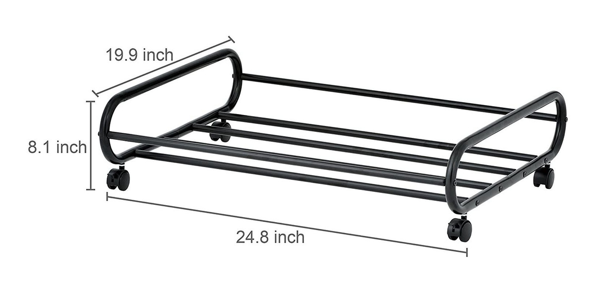 de metal negro liso debajo de la cama estante de almacenamiento con ruedas de rotación; ruedas giratorias y grandes asas abiertas hacen que sea fácil de posición de la parrilla debajo de la cama y tire de él para recuperar los elementos; 25-por-19 pulgadas plataforma abierta se puede utilizar con artículos en cajas o contenedores de almacenamiento grandes; Bajo perfil de laminación marcas de rack uso del espacio vacío debajo de la cama (requiere 8,5 pulgadas de distancia por debajo de la cama); Dimensiones aproximadas: 19,75 L x 25 W x 8 H (en pulgadas) Todos nuestros productos estan en inglés SKU 6102026315