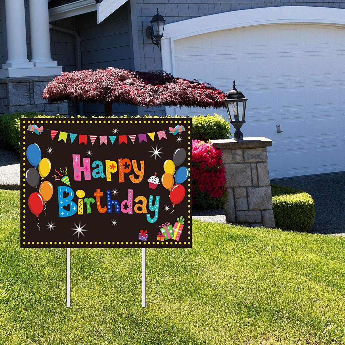 El paquete incluye: 1 paquete de letrero de cumpleaños colorido y 2 estacas de plástico. Letrero de feliz cumpleaños con globos de colores, pasteles y palabras, hace que tu decoración sea vibrante y divertida.; Duradero y reutilizable: hecho de cartón de plástico duradero, resistente al agua y a la intemperie, puede soportar condiciones climáticas adversas; los suministros de calidad para fiestas de cumpleaños también se pueden reutilizar.; Fácil de usar: el juego de decoración de signos de cumpleaños es fácil de instalar en cualquier lugar que desees, solo tienes que insertar dos estacas en cada insignia de cumpleaños y presionarlo en el suelo. Puede ahorrar tiempo para volver a fiestas o tomar fotos.; Amplio uso: gran cartel de cumpleaños impreso con elementos de cumpleaños que son adecuados para varias ocasiones, perfecto para patio, hogar, parque, iglesia, oficina o escuela. Esta es definitivamente la mejor decoración para fiestas de cumpleaños.; Decoración de cumpleaños: decoración de césped de feliz cumpleaños, ideal tanto para niños como para adultos, haz que tu fiesta de cumpleaños al aire libre se vea extraordinariamente linda, perfecta para tomar fotos con amigos o familia. Especificaciones: