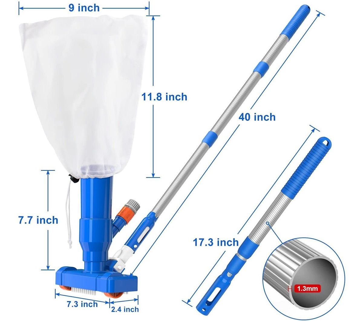 Aspiradora subacuática de lujo para piscina CKE: 1. Mejorada con poste telescópico de aluminio de 0.051 in de grosor, vacío total de hasta 40.0 in. Más conveniente, estable y duradero que otros postes de 5 secciones montados. 2. Mango mejorado, ajuste universal para todos los postes telescópicos de 1.2 in, no es necesario reemplazar el mango para utilizar una barra telescópica larga. 3. Clip EZ normal actualizado, presiona el clip EZ para instalar fácilmente el poste, en lugar de presionar el método de pin fijo. 4. Añade 3 cepillos de limpieza.; Fácil de usar: se fija a la manguera de jardín estándar, la presión del agua de tu manguera creará un efecto venturi, dibujando manchas, hojas y piedras desde la parte inferior de la piscina en la bolsa de recolección. No requiere sistema de circulación de filtro de bomba o energía eléctrica. El mango de vacío de ajuste universal, también se puede utilizar para el tubo telescópico estándar de 1.2 in para aspirar. (Recomendamos CKE 12 pies o 15 pies azul aluminio telescópico Pole, ASIN: b08v87gdp8 o b08v8kydxg); Aplicación: ideal para limpiar piscinas sobre el suelo, spas, piscinas infantiles, piscinas inflables de jardín, fuentes, cascadas, estanques, piscinas inflables y para limpiar piscinas grandes.; Diseño de poste telescópico extensible: poste telescópico de 3 secciones de hasta 40.0 in. No es necesario montar parte de la barra. Consulta la imagen 5 para instalar. Diseño de instalación rápida y fácil. Material duradero que puede ofrecer un uso más estable y prolongado.; Lista del paquete: 1 paquete de aspiradora sumergible para piscina con 3 cepillos de limpieza y bolsa de hoja, 1 paquete de barra telescópica de 3 secciones, 1 paquete de mango de vacío de ajuste universal, 4 clips EZ y 4 varillas de conexión. Viene con servicio real: un año de reembolso o reemplazo de garantía si no estás satisfecho. Color:Azul lago