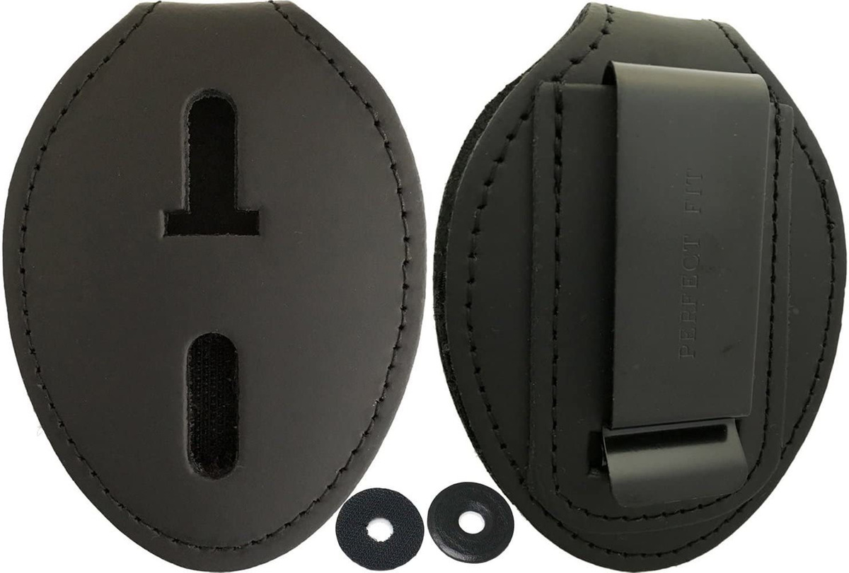 Piel negra resistente para uso profesional; Se puede llevar en el cinturón o alrededor del cuello (cadena incluida); Para insignias ovaladas y de águila; Clip de tensión de metal resistente en la parte trasera; Sostiene mejor insignias de estilo pin, algunas insignias de clip; Incluye paño de pulido para insignias Este soporte universal de cuero negro ovalado tiene un clip de tensión de metal en la parte posterior para que puedas sujetarlo en el bolsillo del cinturón o pantalón.