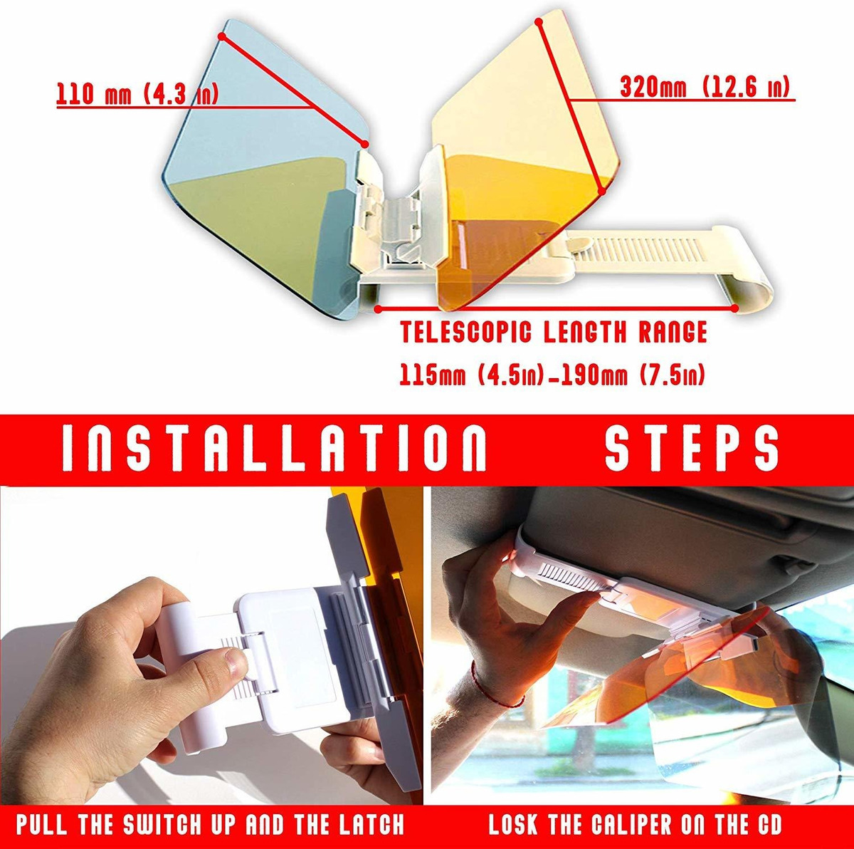 Nuestro 2 en 1 día y visión nocturna antideslumbrante de conducción visera comprende 2 escudos protectores. El escudo gris transparente reduce los rayos UV nocivos hasta el 97.4%. El bloqueador de sol resplandor días contra protege los ojos sensibles a la luz brillante día diferente mientras se conduce. Puede utilizar la visera parasol para el coche con o sin gafas de sol. El tiempo gris o días filterof el extensor de vehículo automóvil ayuda a reducir el deslumbramiento de la mañana fuerte o luz de la tarde, así como los reflejos del sol de otros coches, ventanas, carreteras, superficies lisas o nieve. El tono amarillo de la visera del parabrisas de conducción anti-deslumbramiento se utiliza durante la noche. El visor nocturno para la conducción reduce todo el resplandor de las luces de la calle, publicidad de la iluminación y luces en dirección opuesta y en especial de los vehículos que se sientan arriba de la tierra o usen los faros azules brillantes.