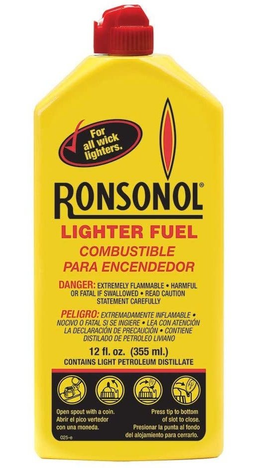 12 fluid ounce bottle of lighter fluid; For use with all wick Lighters; Contains light petroleum distillate; Lights instantly; Made in USA; Lights instantly Ronsonol Premium Lighter Fluid will keep your lighter working at its best. Zippo Premium Lighter Fluid comes in a 12 fluid ounce can. Todos nuestros productos estan en inglés SKU 4022238181
