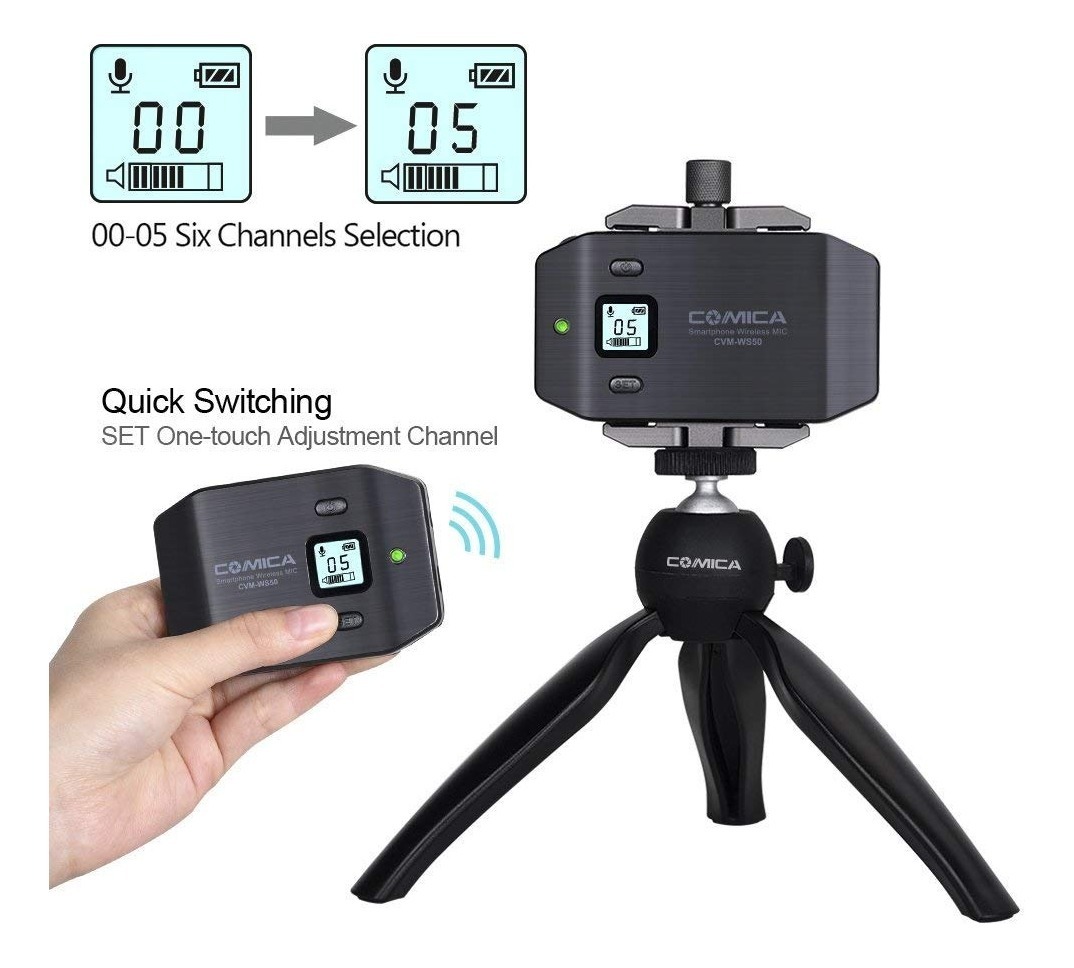 ¿ ¿pantalla LCD¿ CVM-WS50 micrófono inalámbrico teléfono inteligente viene con pantalla LCD puede mostrar especial canales, estado de audio, y el consumo de energía, la detección dinámica de monitoreo en tiempo real .; ¿ ¿opcional de 6 Canales¿ opcionales 6 canales, coincidentes canal flexible. cuando otros canales son perturbadas en el mismo espacio o cerca de la distancia, se puede cambiar rápidamente el canal para evitar interferencias .; ¿ ¿en tiempo real Monitor de audio¿ Inicialmente construir-en función de monitorización en tiempo real del micrófono de pinza teléfono inteligente, se puede escuchar durante la grabación, y monitorear el estado de audio para completar la grabación de una sola vez .; ¿ ¿Distancia de trabajo de hasta 197ft¿ Con la tecnología de ondas de radio ultra alta frecuencia UHF, que se usa para el rango de frecuencias de 520-526mhz, la distancia efectiva sin obstáculos puede alcanzar hasta 197ft, y la distancia obstruido puede alcanzar 98 pies .; ¿ ¿Teléfono ajustable abrazadera y mini trípode¿ procesamiento CNC, con apariencia de alta calidad y cubierta metálica. Anchura ajustable pinza teléfono inteligente, que es adecuado para todos los cabeza de bola smartphones.Mini diseñada para la rotación de 360 ¿¿grados e inclinación de 45 grados, lo que le permite obtener la toma perfecta en cualquier momento necesario, grandes para las perspectivas superiores. Con un cuarto de interfaz puede extensible para la conexión con la luz del LED, Grip, Trípode, Frío-zapato, etc. Todos nuestros productos son de Estados Unidos SKU 30081810462