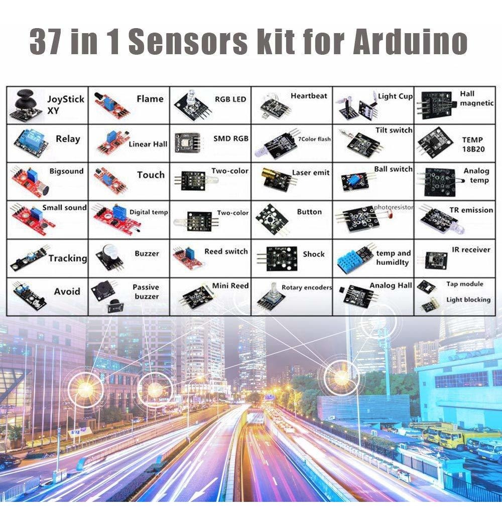 Un grupo se compone de 37 módulos de sensores diferentes que le dan una amplia comprensión de los conceptos básicos de Arduino y sensores .; Un conjunto completo de los componentes electrónicos más comunes y prácticos de la Arduino es la elección perfecta para los entusiastas de la electrónica .; entusiastas Arduino pueden controlar fácilmente y utilizar estos módulos .; Incluyendo los sensores de temperatura, sensores de nivel de agua, sensores de presión ,, módulos de receptor de infrarrojos, etc., para satisfacer sus necesidades diferentes .; Si usted está aprendiendo Arduino u otros controladores, sensores son una necesidad, ya que hay que controlar los datos, como fotorresitores, sensores de temperatura, módulos receptores de infrarrojos, etc., se utilizan a menudo. Esta vez, nos puso a los sensores que la mayoría de los estudiantes necesitan en un juego, por lo que cada uno puede conseguir 37 sensores a la vez, lo cual es conveniente para que todos puedan usar y aprender. Nota: