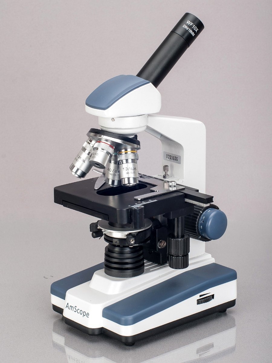 El microscopio compuesto monocular digital de AmScope M620C-E1 tiene intercambiables 10x y 25x oculares de campo amplio, una pieza de nariz orientado hacia adelante con objetivos acromáticos cuatro DIN, iluminación LED, grueso anidada coaxial y de enfoque fino, un condensador de 1,25 NA Abbe, y una doble capa mecánico escenario. La cámara de 1,3 MP tiene un sensor de color, captura y edición de imágenes CMOS de software, y la salida del USB 2.0 para capturar o mostrar imágenes de vídeo fijas o en un ordenador o un proyector. La cabeza de visión monocular tiene una inclinación vertical de 30 grados fijo para reducir los ojos y la tensión del cuello, y la capacidad de rotación de 360 ¿¿grados para permitir el intercambio. Una cabeza de anti-molde conserva óptica en áreas de alta humedad. El revólver de objetivos orientados hacia adelante tiene 4x, 10x, 40xS (primavera), y 100xs (primavera, aceite) objetivos DIN acromático que proporcionan la corrección de color de imágenes aumentadas. Los objetivos 40xS y 100xs son cargado por resorte para evitar daños a la corredera u objetivo al enfocar. El objetivo de aceite 100xs proporciona una mayor resolución sobre un objetivo estándar. El sistema óptico protegido proporciona imágenes nítidas y de alta resolución. Un microscopio compuesto digital se utiliza para la inspección y la disección de los especímenes cuando se desean imágenes bidimensionales, y donde se requiere la captura de imágenes, registros detallados, o documentación.