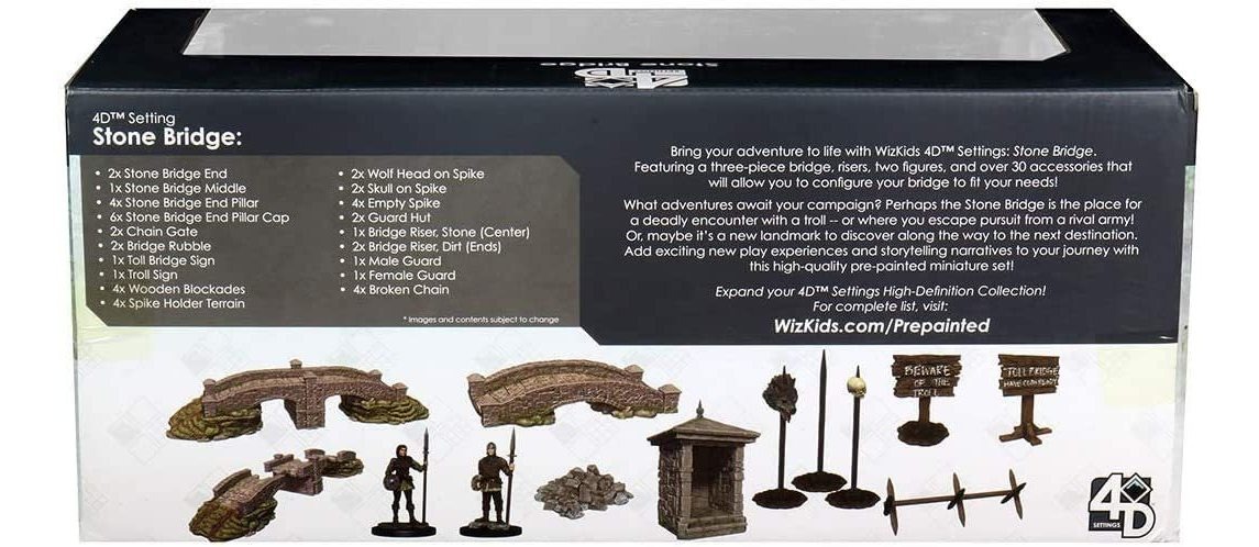 Da vida a tu aventura con los ajustes 4D de WizKids: Stone Bridge. Estas escenas ofrecen más que miniaturas prepintadas para ti, ofrecen emocionantes nuevas experiencias de juego y narrativas narrativas.; El puente de piedra viene con un puente de tres piezas, elevadores, dos figuras y más de 30 piezas de accesorios que te permitirán configurar tu puente para adaptarse a tus necesidades.; Qué aventuras esperan tu campaña Un encuentro mortal con un troll Un escape de un ejército rival perseguido O posiblemente sólo otro hito en el camino al próximo destino.; Estas escenas ofrecen más que miniaturas prepintadas para ti, ofrecen emocionantes nuevas experiencias de juego y narrativas narrativas Bring your adventure to life with WizKids 4D Settings: Stone Bridge. These scenes offer more than just pre-painted miniatures for you, they offer exciting new play experiences and storytelling narratives. The Stone Bridge comes with a three-piece bridge, risers, two figures, and over 30 pieces of accessories that will allow you to configure your bridge to fit your needs. What adventures await your campaign A deadly encounter with a troll An escape from a pursuing rival army Or possibly just another landmark along the way to the next destination. Contents: 2 Stone Bridge Ends 1 Stone Bridge Middle 4 Stone Bridge End Pillars 6 Stone Bridge End Pillar Caps 4 Broken Chain 2 Chain Gate 2 Bridge Rubble 1 Toll Bridge Sign 2 Posts with Friction Fit 2 Road Signs 1 Troll Sign 4 Wooden Blockades 2 Heads on Spikes 4 Spike Terrain 2 Guard Hut 1 Bridge Riser, Stone 2 Bridge Riser, Dirt 1 Male Guard 1 Female Guard Todos nuestros productos estan en inglés SKU 13102121973