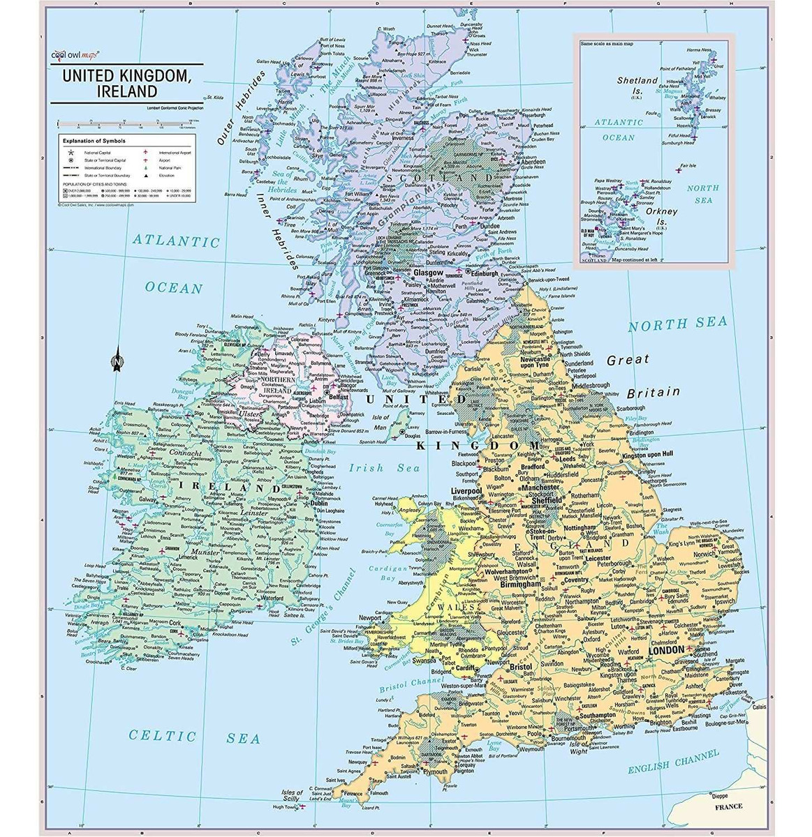 Único, a todo color, y detallado este mapa político de Reino Unido e Irlanda presenta detalles geográficos y precisión. El mapa muestra todos los límites del país del estado del Reino Unido, nombres de lugares, una selección de Parques Nacionales, Aeropuertos, cuerpos de agua y más. Mapas insertados muestran las Islas Shetland y Orkney. Perfecto para escuelas, hogar, oficina o escuela en casa. Todos nuestros productos estan en inglés SKU 91221063143