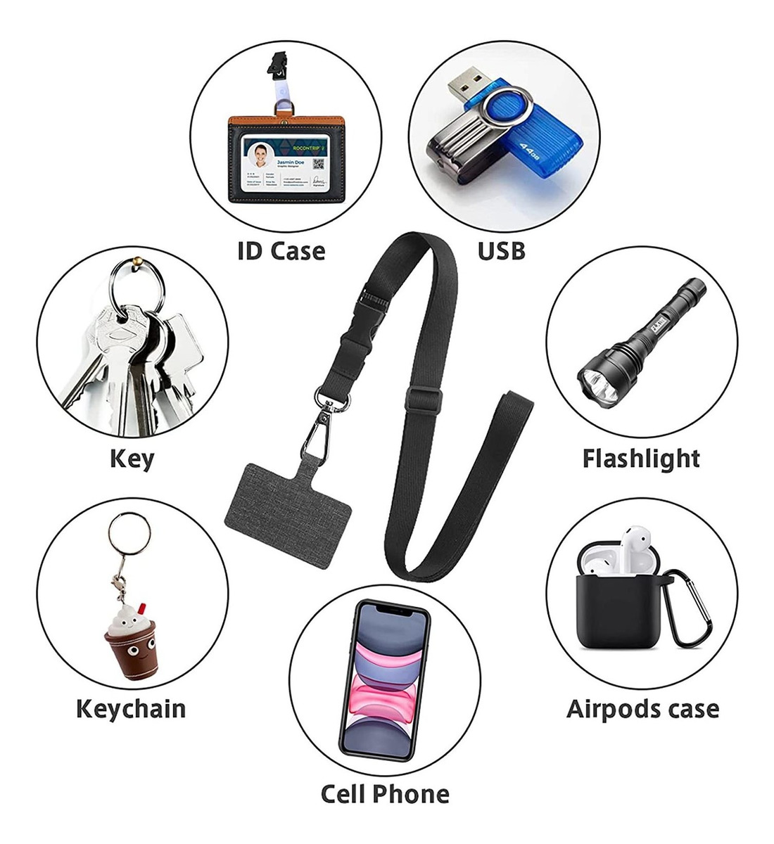 Compatibilidad: este colgante para teléfono se adapta a cualquier funda de teléfono con orificio de carga. No hay necesidad de preocuparse de que el teléfono se caiga o se pierda.; Cortes perfectos: la correa de calidad decente adoptada por el diseño ergonómico se adapta bien al agujero de carga de tu teléfono inteligente. El parche de agarre es versátil y lo suficientemente delgado como para soportar la carga inalámbrica/cable y escuchar música.; Duradero y portátil: hecho de material de nailon de alta calidad con hebilla de un solo toque con correa plana ajustable, se quita y se abrocha rápida y fácilmente, no hará ningún estrés en tu cuello o hombro. Puedes liberar tus manos para tener una conversación con manos libres mientras estás ocupado.; Amplia aplicación: cordón ajustable de liberación rápida de 15.7 pulgadas a 27.6 pulgadas con diseños de parche de agarre universal para un ajuste cómodo en el uso de tu teléfono sobre la marcha. Un accesorio ideal para teléfonos móviles tanto para hombres como para mujeres en la vida cotidiana.; Antirrobo: este versátil cordón cruzado para teléfono tiene tres maneras de llevar, correa de cordón para el cuerpo cruzado, correa para el hombro y correa para el cuello normal. Mantendrá el teléfono seguro y accesible a tu vista, hebilla de metal sólido y correa segura protegerá tu teléfono de caídas accidentales. Todos nuestros productos estan en inglés SKU 91221080658