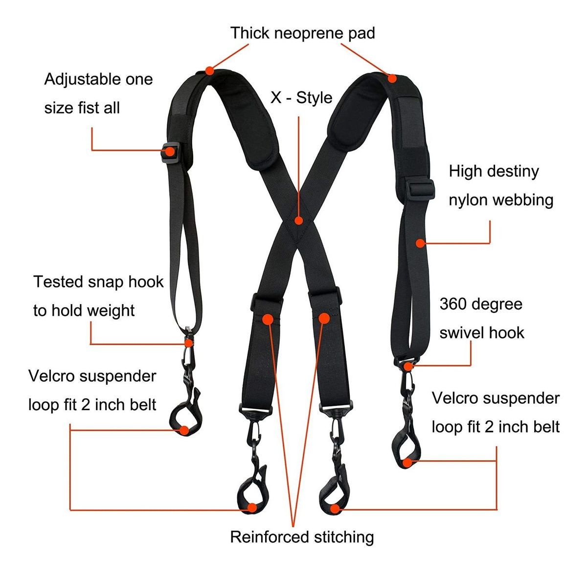 Estilo X: Diseñado para Distribuir el peso del cinturón de Trabajo Sobre los Hombros, quitando peso de las caderas y la parte inferior de la espalda .; Duradero material de – Hecho de resistente correa de nailon. Offers Apoyo Adicional Para Llevar Una Carga Pesada de Equipo .; Longitud ajustable: Correas delanteras y Traseras ajustables que Ayudan una Garantizar la ONU fit Cómodo .; Se ajusta un cinturón de servicio de 2,0 en. Se ajusta un cinturón de servicio de 2,0 en .; Almohadilla de neopreno: Mejora la COMODIDAD de la USO INCLUIDO con Una carga considerable. Todos nuestros productos estan en inglés SKU 21052005642