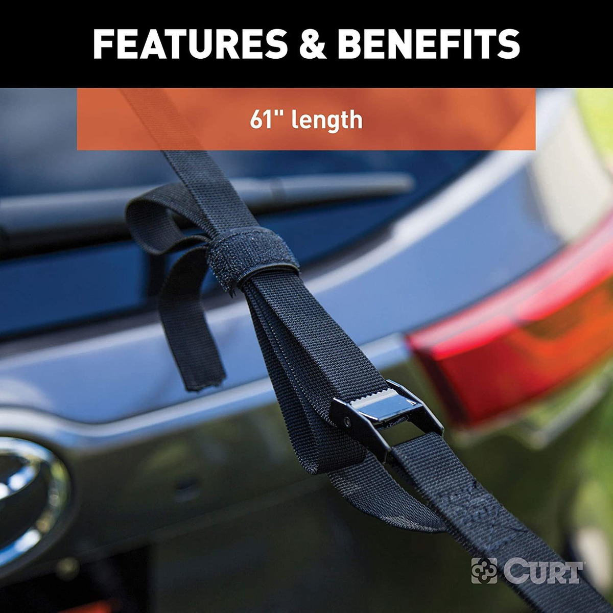 Correa para bicicleta con cambuckle para mayor apoyo y seguridad; curt recomienda el uso de fabricación de esta bicicleta con correa de rack con todas las aplicaciones de enganche; Más apoyo y seguridad Whether you are an avid mountain biker or a casual rider, you will want CURT along for the ride. CURT bike racks offer both versatility and quality and are available in several different styles to fit your needs. The CURT bike rack support strap is a 1 x 61 strap designed to help stabilize a hitch-mounted bike rack. One end attaches to the bike rack and the other to the tow vehicle. The strap can then be tightened to the appropriate tension to ensure that the load is properly supported for travel. Though the bike rack support strap is required for any bike rack with a 1-1/4 shank, it is recommended for all CURT bike racks. Todos nuestros productos estan en inglés SKU 4022202758