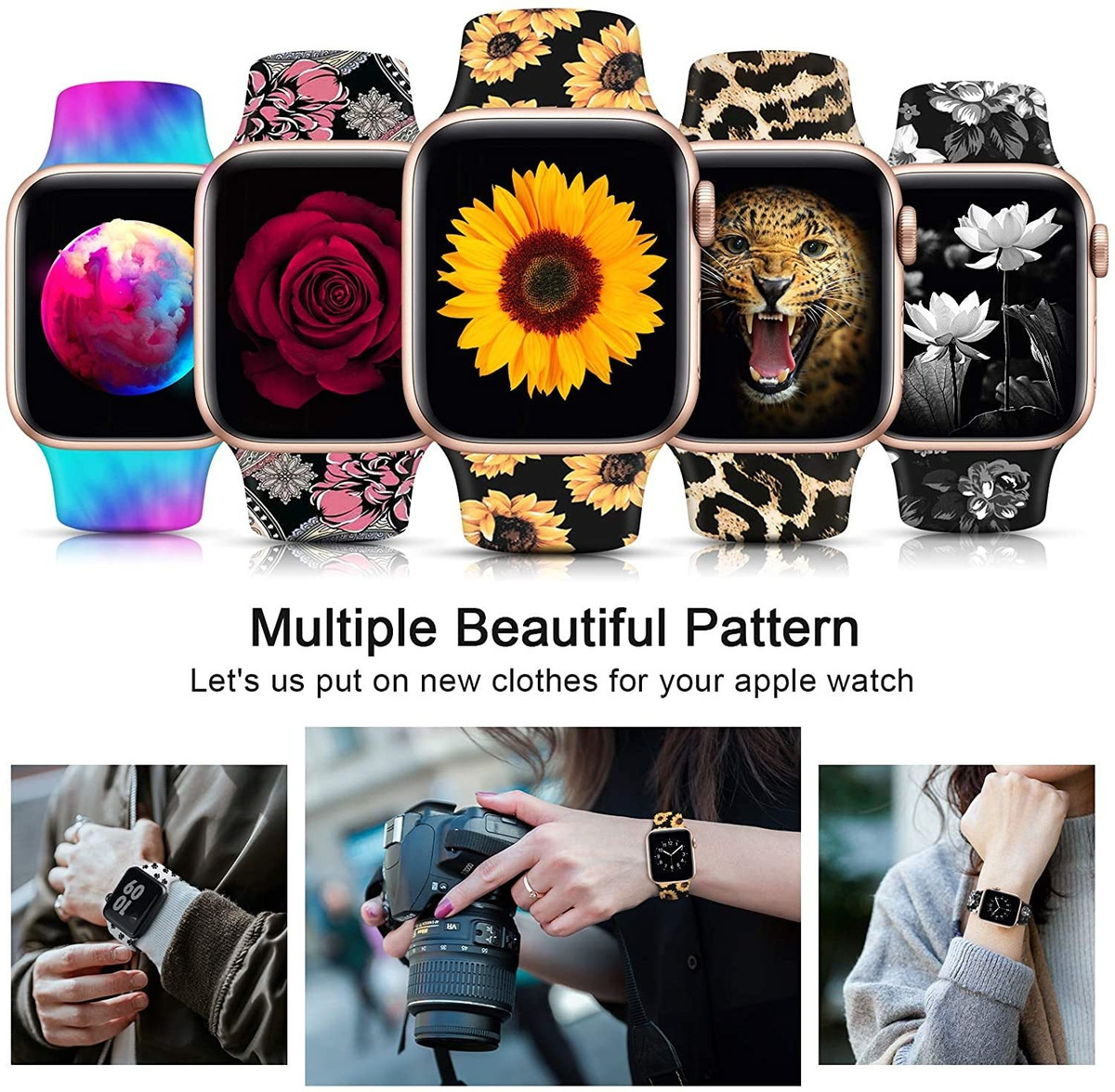 Modelos compatibles: nuestras correas florales son compatibles con Apple Watch de 1.496/1.575 pulgadas de ancho; Apple Watch Series 6, SE, 5, 4, 3, 2. Nota: Solo correa deportiva, no incluye reloj; Tamaño disponible: 1.496 /1.575 pulgadas S/M: adecuado para muñecas de 5.11 -26.77 pulgadas; 1.496 /1.575 pulgadas M/L: adecuado para muñecas de 5.906 a 7.874 pulgadas; mide tu muñeca o pregunta nuestro servicio al cliente antes de realizar el pedido.; Nuevo diseño: Estas correas iWatch para mujer están hechas de material de silicona de alta calidad, con la avanzada artesanía de impresión especializada en los problemas de decoloración y despegamiento. Flexible, resistente al sudor y al agua, duradera, la correa de Apple Watch se engancha en ambos lados, se bloquea en el Apple Watch de forma precisa y segura, fácil de instalar y quitar; Personaliza tu iWatch con estas divertidas correas que se adaptan a tu estado de ánimo y atuendo en la vida cotidiana. Recibirás toneladas de cumplidos sobre cómo son impresionantes. Un regalo ideal para tu familia y amigos; – – Todos nuestros productos estan en inglés SKU 91221080400