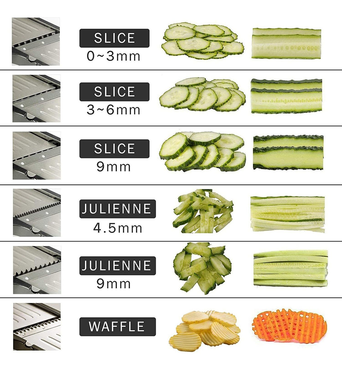 Mandolina rebanadora con guantes a prueba de cortes: este cortador de madoline con dos cuchillas intercambiables puede ayudarte a cortar rodajas de frutas y piezas de gofre. No es necesario tocar la hoja para limpiarla. Hemos hecho un regalo de guantes para protegerte. La hoja del cortador de verduras es muy afilada.; Cortador de madoline con diferentes cuchillas: nuestro cortador de verduras tiene 4 tipos diferentes de cuchillas, incluyendo cortador en juliana, triturador de alimentos grueso, cortador de piezas redondas y cortador de patatas fritas. Puede cortar alimentos de 0.039 in de grosor a 0.354 in de grosor. Dos ajustes en juliana 0.177 in y 0.354 in también hace patatas fritas o patatas fritas.; Cortador de verduras perfecto: este cortador de madoline se puede utilizar para muchas frutas y verduras, como patatas, tomates, cebolla, pepino, limón, manzana, naranja y así sucesivamente. Es un accesorio de cocina ideal. Está disponible para cortar todo tipo de alimentos como queso. Pasarás menos tiempo preparando alimentos y disfrutando de más tiempo con ella.; Cortador de verduras: un regalo ideal para la cocina. Puedes comprar este cortador mágico de alimentos para tu hogar. Es un gran regalo de cocina para personas que trabajan en casa. Ahorrarás mucho tiempo en cortar alimentos y preparar alimentos rápidamente. También puede ser un gran regalo de Navidad para las mujeres que aman cocinar.; 5. VEKAYA servicio al cliente posventa: VEKAYA cree en hacer la vida más fácil, mejor y más agradable en todo lo que hacemos. Si tienes cualquier problema después de usar el cortador de madoline, por favor ponte en contacto con nosotros lo antes posible. Responderemos en 24 horas. El producto viene con 1 año de garantía, no solo ofrecemos buenos productos, sino también buenos servicios. Todos nuestros productos estan en inglés SKU 91221045914